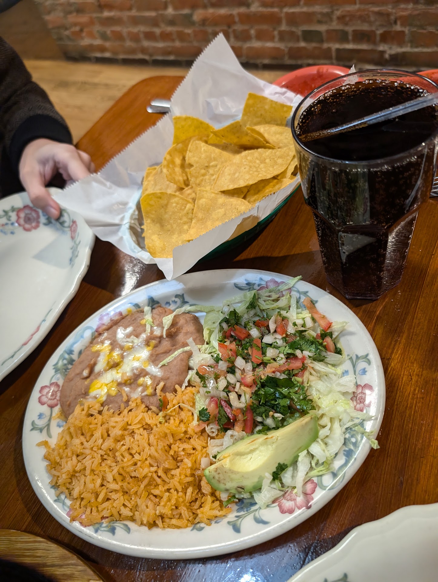 Ordered the Suiza and Crema enchiladas. They came out promptly on a plate that had clearly been under a broiler. The green sauce tasted like a canned purée. The crema sauxe was not sauce, more like caked on, broiled ricotta cheese. It was bizarre. The ground beef inside had the texture of finely ground Taco Bell meat minus the seasoning. Rice was hard and bland, beans were runny. A soda will cost you $2.75 by the way.