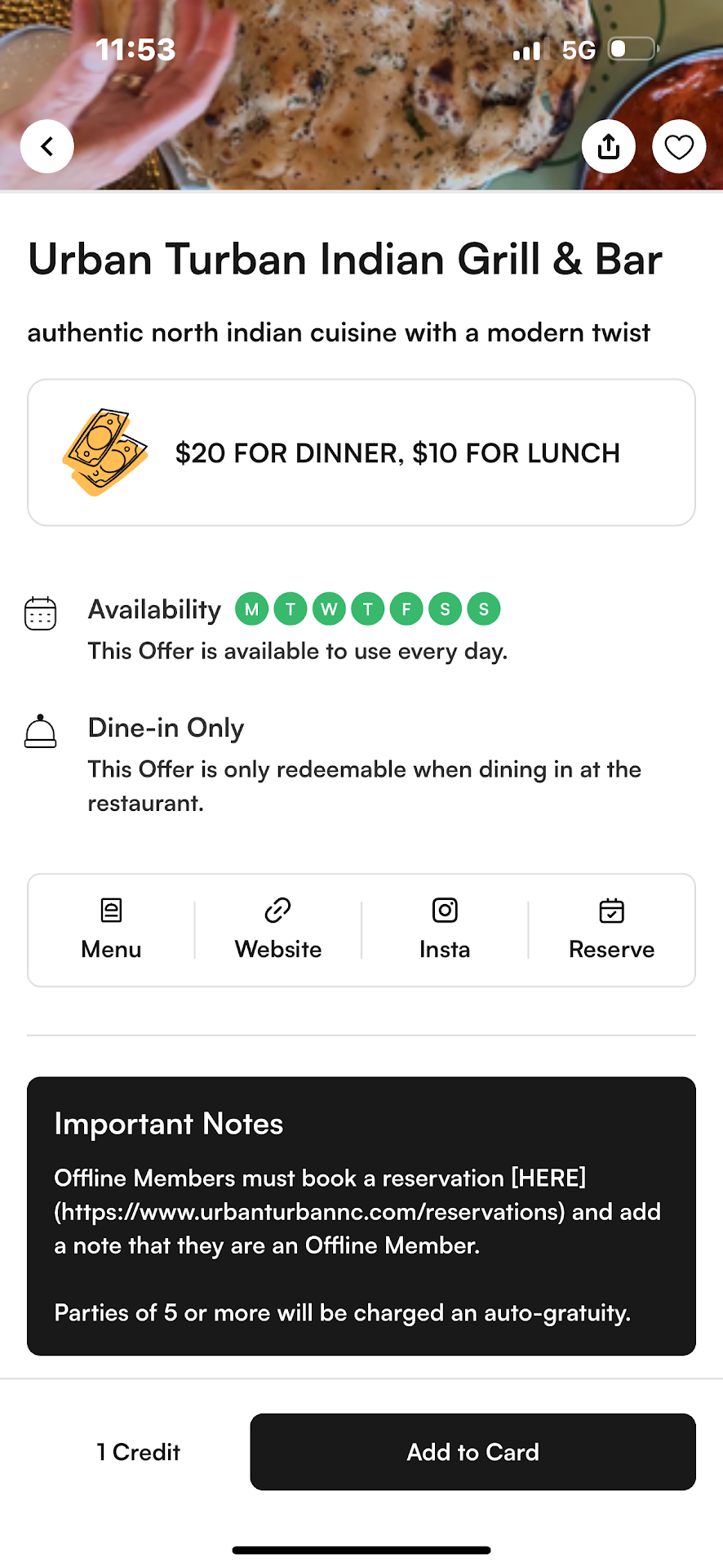 Never judge a book by its cover! While taking a lunch break in the area, I decided to stop by this place to check out the menu and grab some garlic naan to go. My wife was told by a co-worker that the food was delicious. And since Indian cuisine is one of my all-time favorite foods to eat, I thought this was a perfect time to try it out. Indian cuisine varieties seem endless and theres never a lack of flavor in most of their dishes... To the naked eye, I look like a city or a sanitation worker whenever I walk into any establishment for lunch, and Im ok with that, or should I say Im used to that.. however, Im always able to pick up on the subtle "blow off" feel that I get when I walk in some eateries, I often wonder if they even realize what they're doing.. Anyway, what they don't know is that Im a well traveled restaurant/food critic. By trade Im an Arch/Mech draftsman who designed and set up my fair share of restaurants, from your mom and pop places to your Parizades and beyond. My footprint extends well beyond the reaches of NC. By nature, whenever I walk into any restaurant, Im rating you from the moment I walk into the door, until I leave. The first thing I look for is your santitation grade. If you've just opened your doors your grade should be very good, if it isn't you likely have issue's in your kitchen or bathrooms. Once I deem its safe to eat, I interact to see if this a one and done or will I be returning with my family on a regular basis.. Now on to the review. The person who greeted me was professional and courteous, he welcomed me and asked If I was dining in or ordering to go, I told him I was ordering to go and he lead me to the bar where I could sit and place my order. The person who took my order was less than cordial and not very helpful, maybe I looked out of place to him, I asked questions about the menu and was really looking for something quick and needed his guidance, I could tell he was slightly bothered and brushed me off. I picked up on that quickly and settled in, forgetting he was standing there while I searched the menu, I found the butter chicken tacos and ordered those with a side of garlic naan, the place wasnt terribly busy, this was around 2:30 only 3 tables being served, several people walked in to pick up/ place order's, my order came out last while the gentleman was handling another transaction he was ringing up, somehow he mixed up the pick up order and had to separate the order checks, I managed to get his attention to my order, his attitude changed abruptly which really bothered me. I sat outside and decided to eat one of the tacos and take the rest home. The taco was good but not as flavorful as I had hoped. The naan was delicious. My purpose for this long review is to let the folks that run this place know, never judge a book...