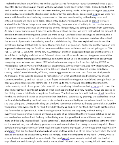 Read moreWe stopped by for lunch today, which we always do when on vacation since my family is from the area. When we noticed no one was wearing a mask, we decided to go elsewhere. After exiting, I assume the owner, came out verbally attacking us. She basically yelled at us wanting to know why we left, I just stated it was due to no one was wearing a mask. She went on to tell me that you only need to wear a mask when entering a building, when was the last time I washed my hands, why did I go there, etc. With small businesses struggling, we have always supported them. However the extreme rudeness and unprofessional attitude, we will never patronize this business again. If your customer comes in with a mask, just mask up. You never know who has an underlying medical issue and you should be protecting your patrons and staff, not attacking the lifeline of your...