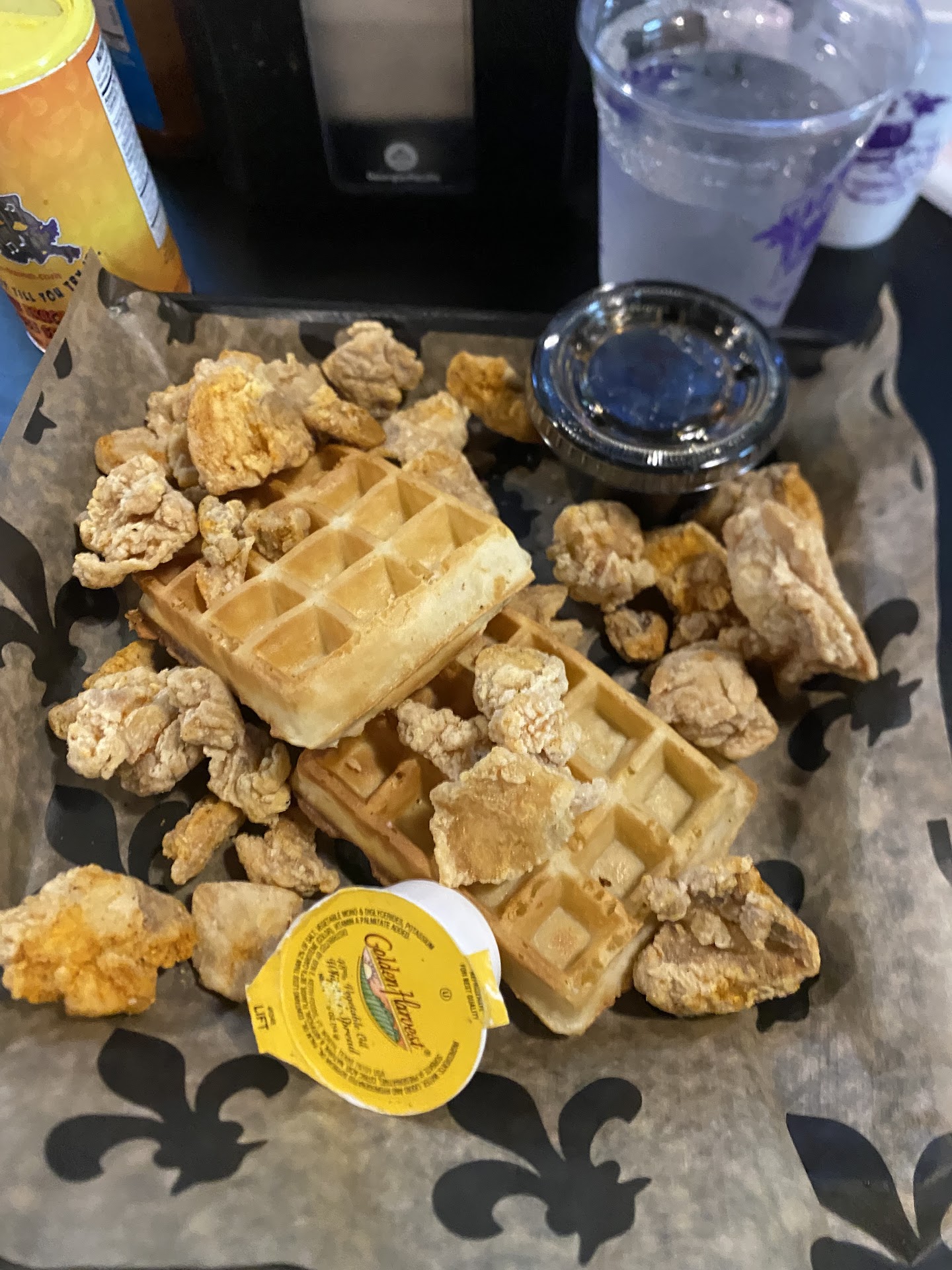 The menu is small but offers some solid breakfast options. While it doesn’t mention it, you can order a la carte—my son had bacon, eggs, and a biscuit, and everything came out just right. We ordered beignets for the table, and they were absolutely delicious—definitely a highlight for all of us. My father-in-law really enjoyed his Bloody Mary and the breakfast tacos, and I had the chicken cracklins and waffles, which were flavorful and satisfying.