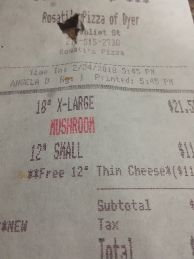The food isn't great. The Rosati's in St. John is much better and the staff is actually nice. I've tried this Dyer branch four times and each time the staff was rude and the order was late. Not only that, it varies every time. It's like no one was trained.
