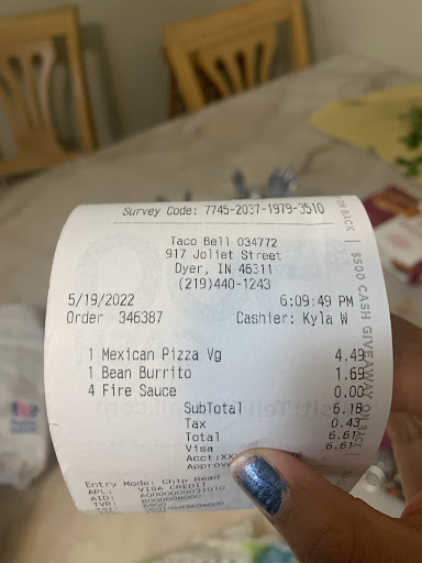 Read moreI absolutely love Ashley! She is usually the drive thru gal that I see whenever I pick up a mobile order. Tonight I ordered for myself and was excited to see that she was working. She has a great personality, always comes across happy and cheerful and had awesome customer service. I honestly think she would make a great manager and hope she does well in life regardless. To the general manager of this location... This young lady deserves a raise! But on to the food, tonight I ordered two bean burritos, with extra red sauce, add sour cream, and three regular soft tacos and a lrg root beer. The food was well made and presented well. As an ex employee of Taco Bell from the late 90's I know how these items are supposed to be made and I also know how the beans are supposed to be prepared. I say this bc the beans were perfect and the consistency was on point. I've been to many Taco Bell's in the past where the beans were dried clumps of too or so runny you could have mistaken them for something else. The tacos were well made as well, by the time I got home the Hubby's cheese had melted a little but he didn't mind and happily inhaled all three. Had it been up to him I'd have probably gotten him six but he's grounded after eating half a family sized box of chicken in a bisket. (He's supposed to share!) The meat was perfect and the lettuce was perfect too. Y'all get 5 stars for customer service, speed, food presentation and food taste. Great...