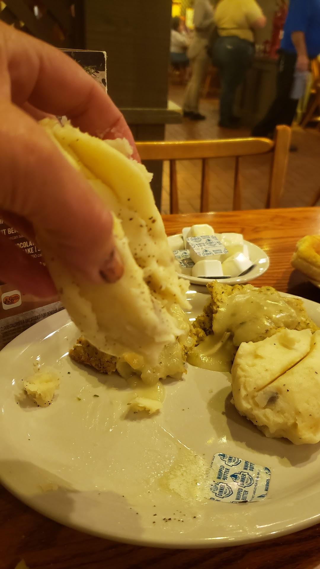 Read moreMy husband and I went to this restaurant for Thanksgiving Dinner. We had gone to one in OK for Thanksgiving before and it was great so we didn't think twice about going to this location. We were told we absolutley could not trade the sides on the Thanksgiving Plate Special to begin with, my husband requested the sweet potatoes and cranberry relish NOT be put on his plate at all and I requested the sweet pot. NOT be put on mine, the server repeated we could not exchange the sides, we explained we just didn't want it (why waste the food .. right?) she said she had to ask the mgr. finally she came back and we just went ahead and ordered the veggie plate additionally so we could get sides we preferred. When the plates arrived unfortunately mine didn't have the cranberry relish, I decided it wasn't worth pointing out but they at least honored the request of but wanting to waste food. When I went to bite into my mashed potatoes.(which are my favorite) ... well.. they were so hard that literally (as shown in the picture) I picked the serving up with my hand. At this point I had another server get a mgr. He was very professional and exchanged our veggie plate with hot fresh food, and explained it's Thanksgiving and the cooks just had not stirred the vegetables under the pans (because they are youngsters). The dressing was great and the very thin 2 piece turkey was good. I do not recommend going for Thanksgiving and overall, I won't go back to this restaurant. We live in an area that does not have many options for dining out, so the decision wasn't easy but I'd rather have a gas station then this Thanksgiving Plate again. I didn't request a discount, $50 later we left...