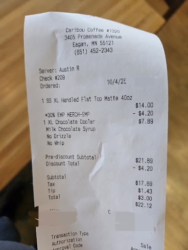 Read moreUsually when I go to this Caribou shop - everyone is really nice and this is a pleasant place to work in! It's very close to my house and I've been going there for a long time.