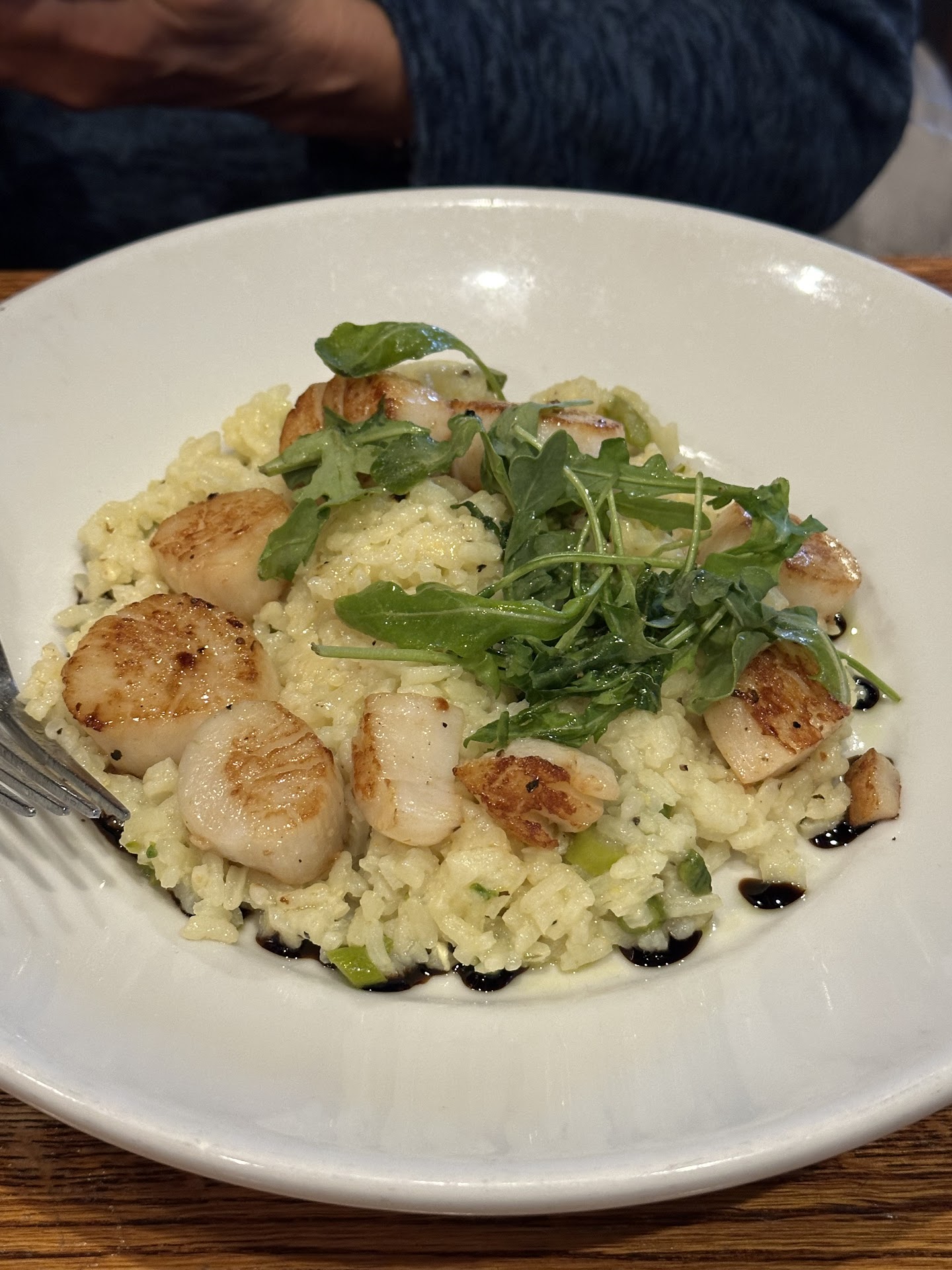 The salad arrived with an absolutely beautiful presentation but, as was the case with the soup, it was bland and disappointing. I’m not a chef, not even close, but here’s my reaction/suggestion regarding the salad. Fwiw, I asked for it without the cashews. The salad has plenty of crunch with just the crispy thingies on top of the salad. There’s no need for the banana chips. Likewise, the banana slices themselves added nothing but confusion to the salad. What was I supposed to be tasting? What would give the salad some “punch”/flavor? For my taste, I wish there had been double the dollops of what I think was wasabi. THAT would have given the salad some flavor. What was my lasting impression of the salad. Flavorless crunch. It wasn’t a bad salad; it just had no flavor.