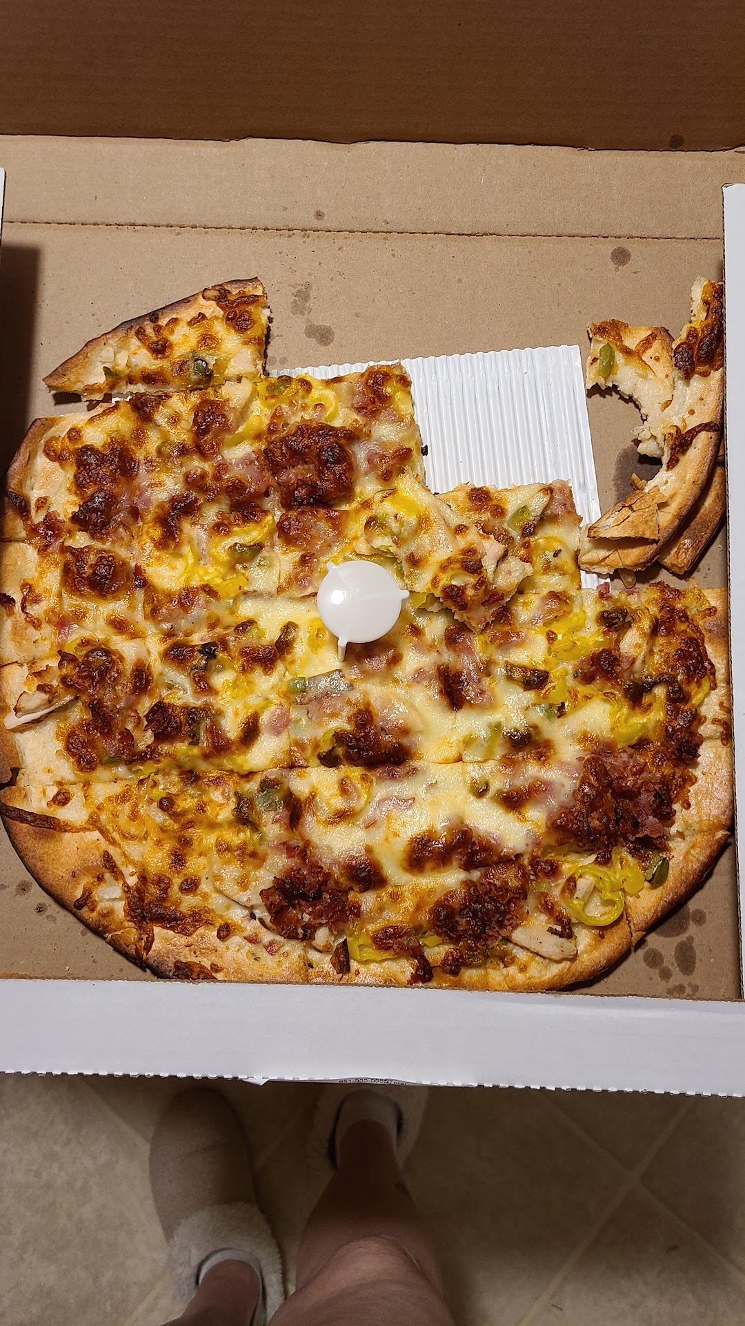 My main gripe was it took a ridiculously long time for delivery. I was told 45 minutes and it was an hour and 15 I believe, which if I was told they were that busy I'd have picked it up. It would also be appreciated if you'd ask if I want peppers since the drivers don't seem to carry them.