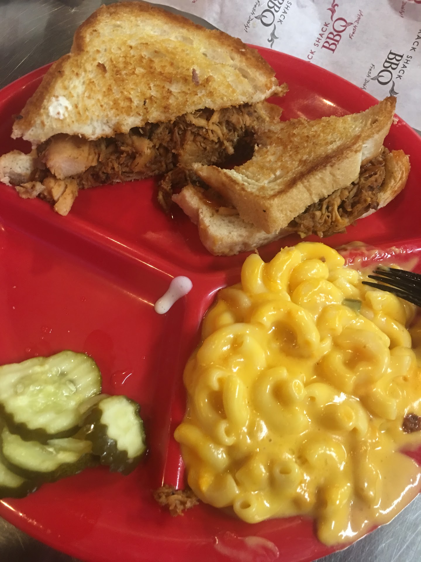 Read moreFirst time at Rack Shack tonight and it did not disappoint. The atmosphere was great and the place is really nice for a bbq âshackâ. The young lady at the register was very helpful and answered all of our questions, several times. Our food was prepared and brought out to us much faster then expected. Best part, service wise, was that shortly after we got our food my wife knocked my pop over, spilling all over the table and my foodđ. The same young lady that took our order was over at our table helping us before we realized what was going on. She immediately took my plate of food away and said a new plate would be out shortly, which it was! Then she helped us clean up our mess.