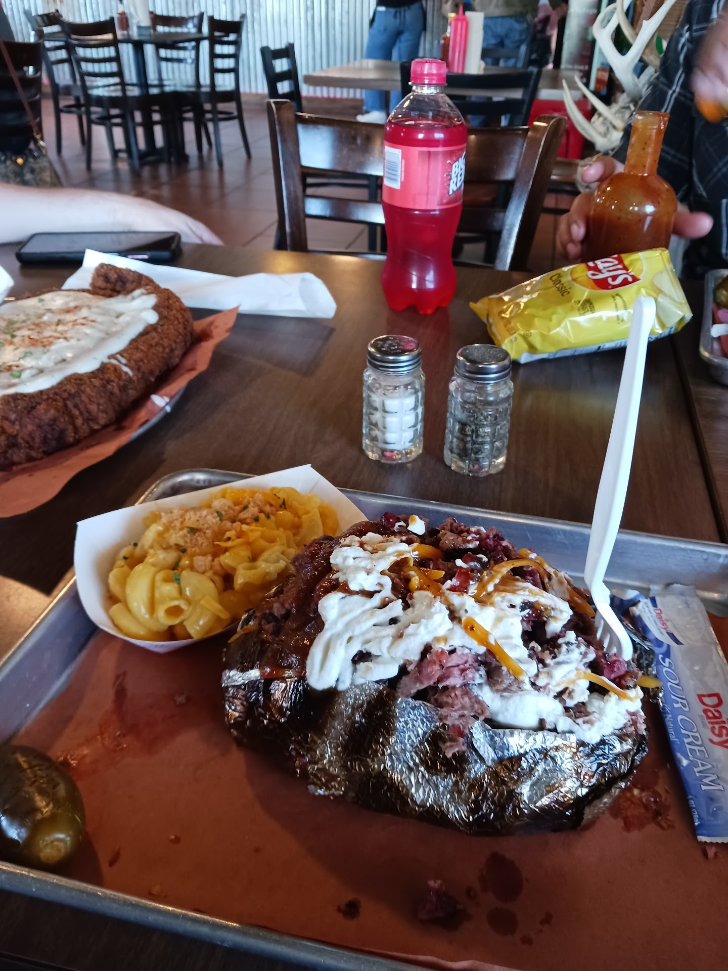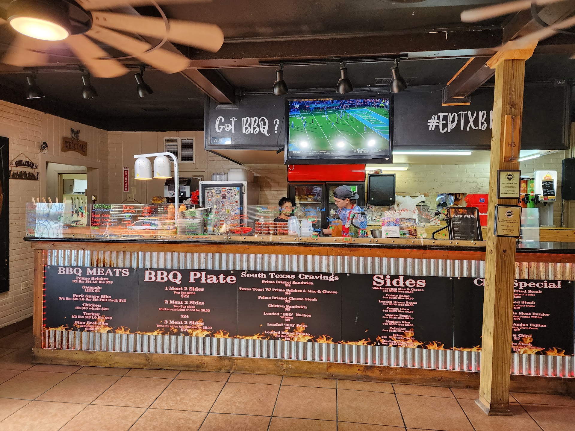 I have seen The Wagon Wheel and their famous chicken fried steak on social media for a long time now. Eagle Pass Texas is quite a drive for normal travelers, but I happen to be working here today. After finishing my jobs late afternoon, it's definitely time to eat. The restaurant is a small, local business with a great interior and friendly staff upon arrival. Late afternoon seems to be a good time to visit, as there were plenty of tables available in the air conditioned dining room. They do have a nice outdoor patio if the weather wasn't so damn hot. They have a very extensive BBQ selection from brisket by the pound, ribs and pork. But I'm here for the star attraction. The CFS is served on a pizza pan with 2 sides, Texas toast and a roasted jalapeno. And I gotta have the sweet tea of course. The CFS is topped with peppery country gravy, chives and paprika which makes the plate very appealing. As one should expect with a steak this large (it's a 2lb sirloin) the edges are darker and crisper due to the frying process. As I cut and ate my way to the middle, it got better with every bite. I ordered the cheesy mashed potatoes, and green beans. Both were satisfactory BBQ joint standards. I ate almost half of this creation, with a few bites of the sides and piece of toast. This meal could easily satisfy 2 people plus another one. I'm taking it all home for later. I was able to use my stamp and then have a lovely chat with Selena, the owner. Absolutely make a trip out here someday if you are a CFS connoisseur like myself. Tell Selena that Maloy sent you.