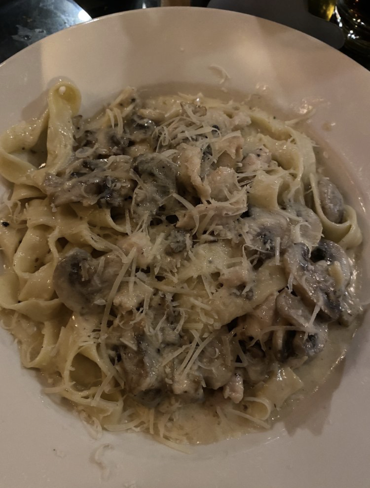 -Okay now for the entrees. Chicken Parmesan was good, nothing crazy spectacular though. I will say though if you like spicy, the spicy Alfredo is the best choice. Also got the Leonardo (chicken Alfredo), that was good too, decent. You could tell the noodles were homemade but the sauce was just okay. Everything just seemed decent, nothing hit it out of the ball park for us this visit. Service was also just a little slow but she did her best and we were grateful for that (just felt like we were searching for her a lot). Another thing is, the atmosphere was really dark and dim lighting, so make sure to wear your glasses if you need them lol I couldn't really tell how much salt I was sprinkling onto my salad haha Anyways give it a try and see what you think. You may or may...