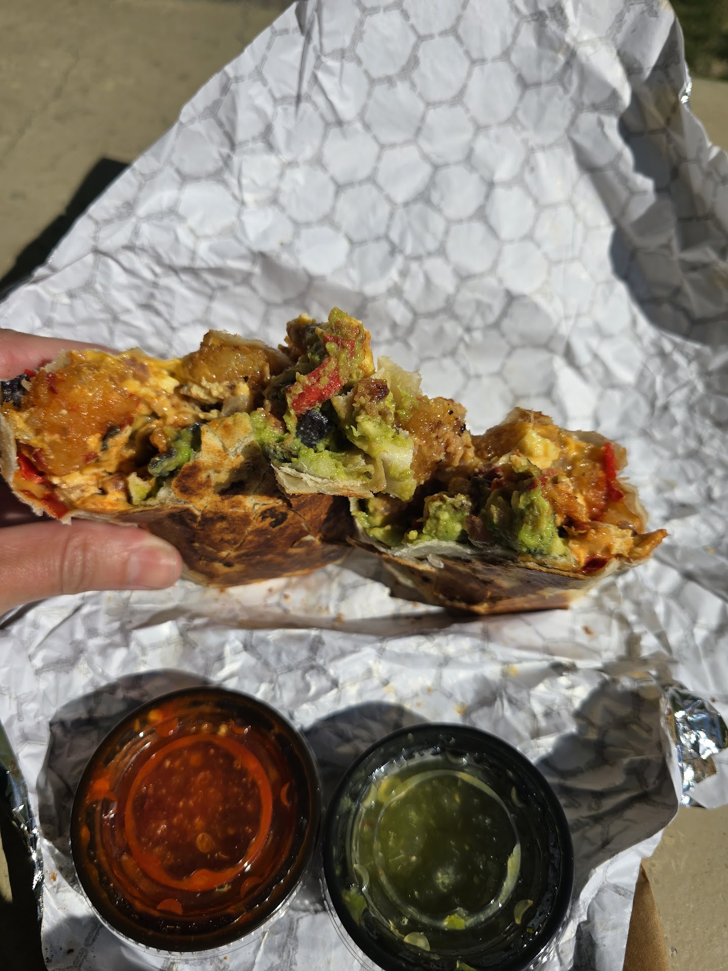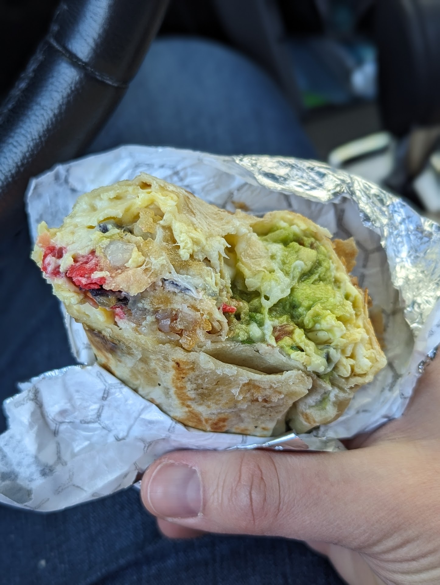 Read moreI'm a fan of breakfast burritos, so when I saw this restaurant on the map I was thrilled to try it out. Maybe I just made the wrong choice by buying the Eggy and Cheesy, but I wasn't in the mood for carne asada or the other options. What I got was about half guacamole, and had little flavor since the other ingredients were tater tots, egg, cheese, tortilla strips, and crema - all very neutral flavors. I might give this place another try and go with a different menu item, but I can't give what I ate more...