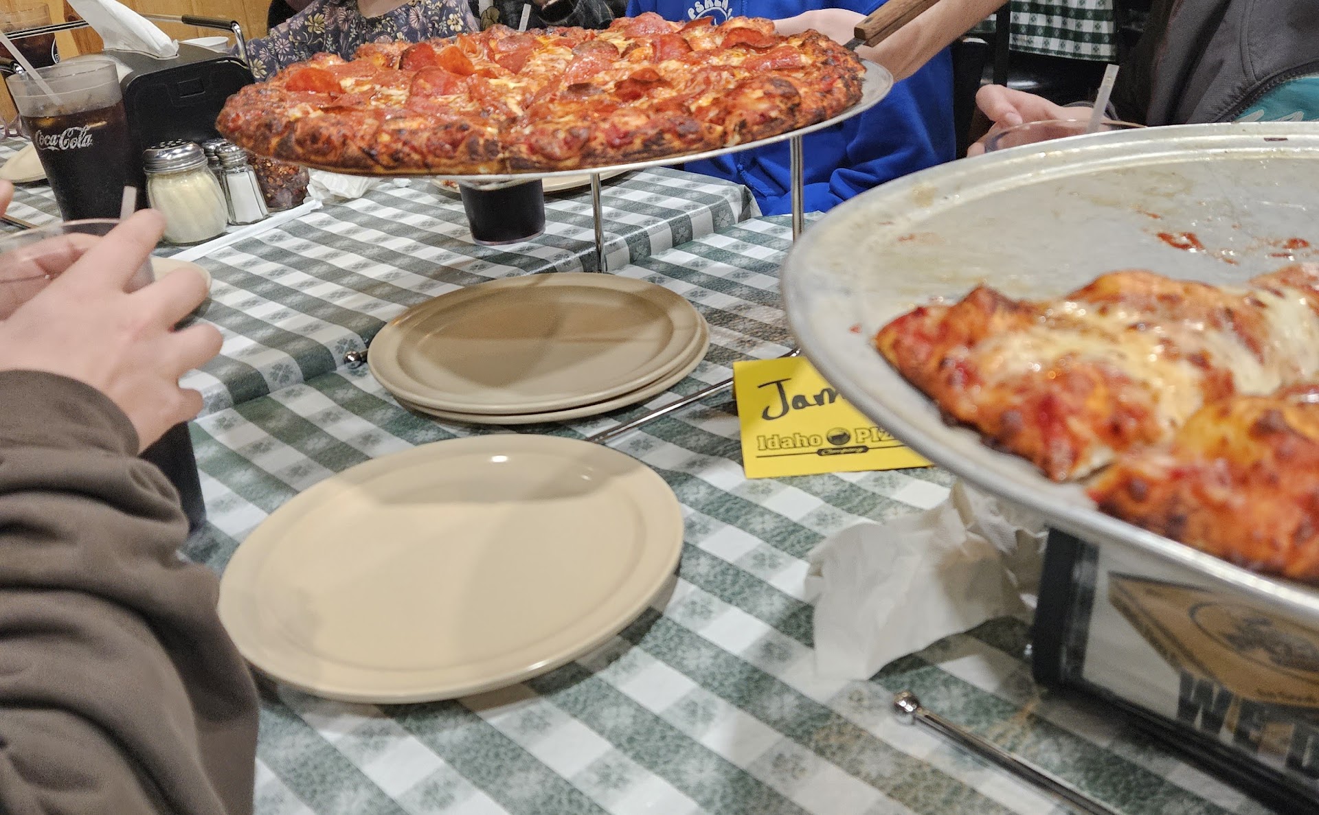 Located off Riverside Drive in Eagle, it is in a small strip mall near a pond and fountain. The entrance is not large, but once you get in, there is plenty of seating. You order at the counter, they give you a yellow card with your name on it, and you go find your table. We ordered a medium pepperoni pizza and two salad bars.