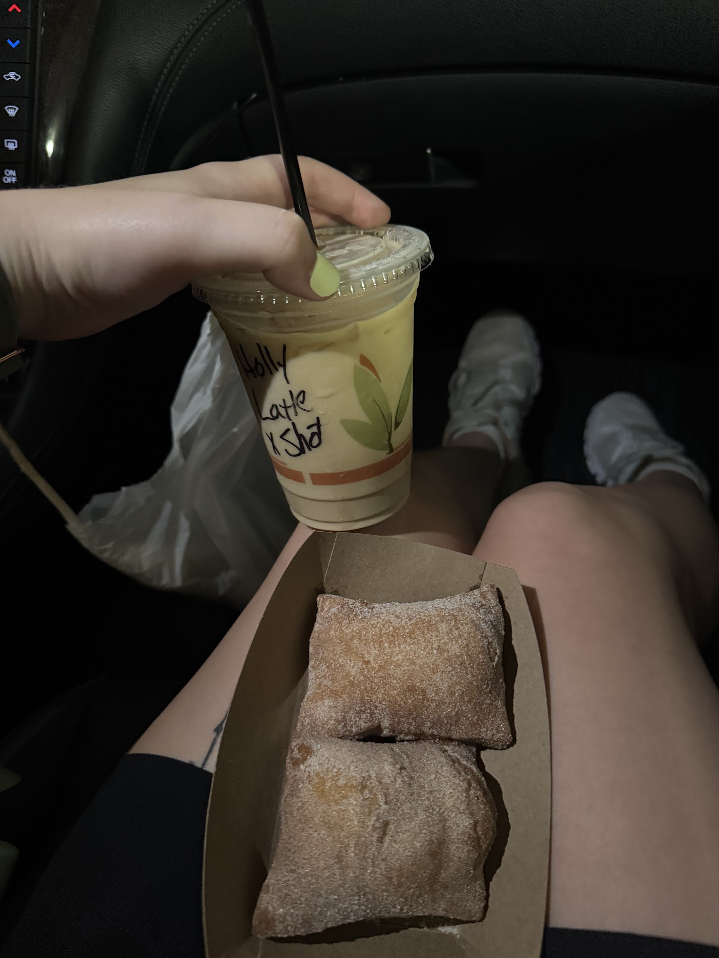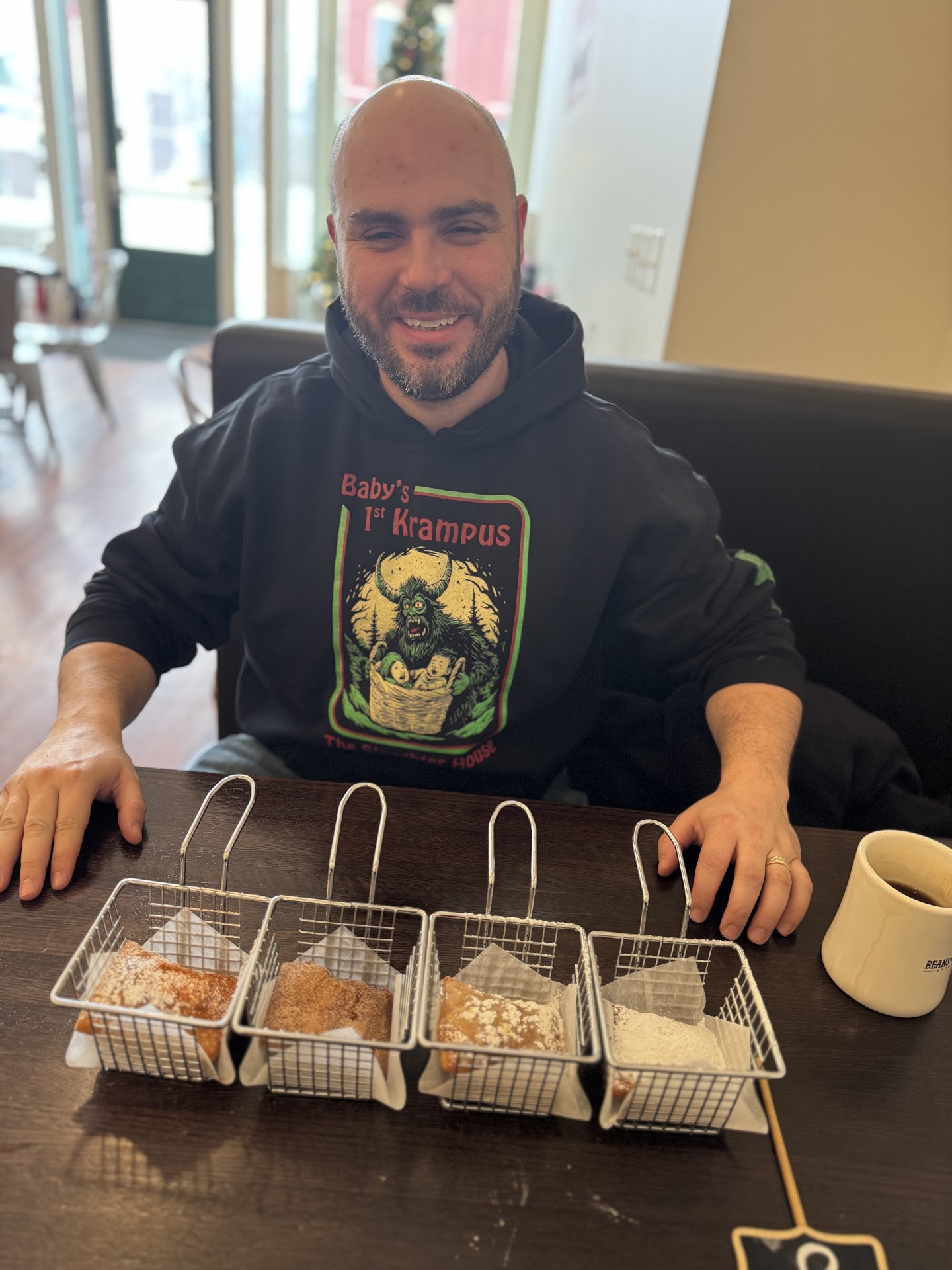 Right away, we were greeted by the friendliest staff. They had four different flavors of beignets. Mind you, I’m an old soul and typically go for the classic powdered sugar. However, this time, we tried one of each. There was, of course, the classic powdered sugar, but they also had one with a lemon glaze, one with cinnamon sugar, and, last but not least, the dark horse: a spicy powdered sugar topped with chili powder and hot honey. They all turned out phenomenal.