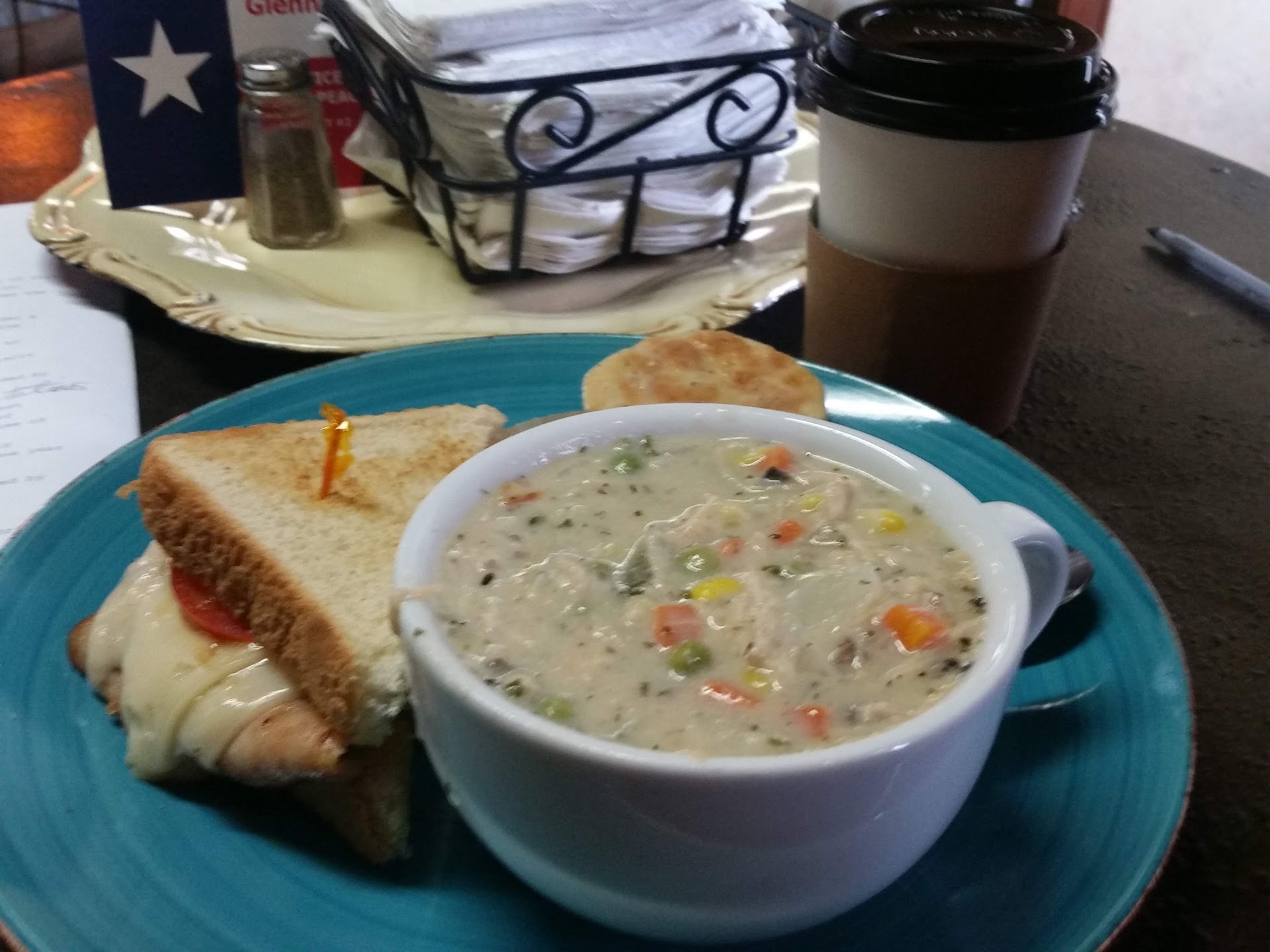 I was there at 10:45 am and was able to get lunch! Update grabbed quick cup of coffee & day old apple muffin ($.50) great! Lunch after court. Renovated Bank, decor is cute with the Bank Vault open. Got 1/2 Sandwich w/ cup of soup and coffee apprx $9. Location has no sign so I have probably dtiven past this location 50 times not having any idea it was there. Service fast and friendly. Soup of day was chicken pot pie that had no broth and really should be called stew, and was more than I could eat. Will try this place again, they offered lots of coffee drinks...