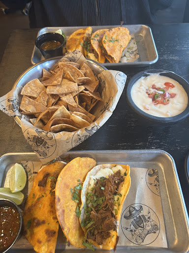 We ordered two appetizers: the elote and the nachos gigante with added birria. The elote was super flavorful, and I really liked the sauce they put on it. I wasnât crazy about the nachos. The amount of meat was small, and it was all clumped in the middle and felt dry. I think it would have been better with more meat spread evenly and some of the birria sauce poured over it. For our main dishes, my friend got the shrimp tacos, which were just okay, and I tried the Bandoleros smash burger, which was honestly amazing and full of flavor. The fries were a letdown because they were too soft, and I prefer them crispy. We were too full for dessert, but I definitely want to come back to try it. Next time we will probably go on a weekday when it is...