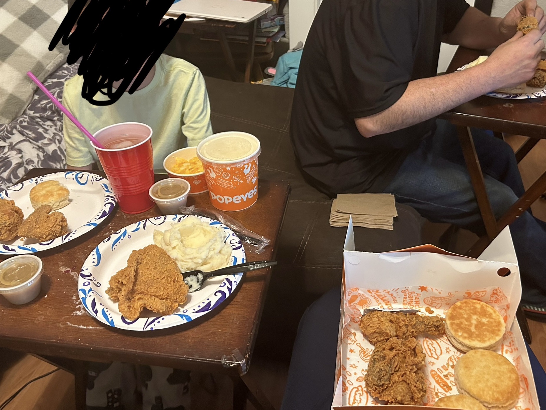 I was VERY disappointed. First, we went to the drive thru and told the guy that I wanted the $24.99 10 pc family meal deal on the app and he told me they only serve 8pc or 12pc ..I was annoyed and me and my family were rushing. We knew it was a new place that opened so maybe they’re not following the app? So we went with the 12 pc(which is the same meal deal as the app but with 2 more pc of chicken and 1 more pc of biscuit) …fine.. we got to the window and the order came to 55 something.. I showed the guy the app bc it was a huge jump for an extra 2 pcs(we also got 2 reg sides too) anyway the guy looks at the phone and told me they do the app, he just needs the number.. he finally rang it up and it came out to $35, which sounds way better than 55 for an extra 2pc of chicken and a biscuit…we saw him tell the other kid that it’s no longer a 12pc, it would be a 10pc. ..the other guy gave us our bag and we began to drive off but thank god I checked the bag bc he forgot our 2 sides…we backed up and the guy gave it to us after confirming with the cashier. Then, we finally got home and needless to say we only had 8 pcs of small chicken.. no breast at all. I was so upset but after working all day at the HMH hospital, being short staff, having my son and I hungry af.. we just said f it. I was so happy bc I love Popeyes and I was happy to see one closer to us. The food was good. The cashier was ok. We just wish the order was correct. It’s not hard to count to 10?🤷🏻♀️ In the picture below it looks like 7 but I did count it and it’s 8. There’s 2 overlapping in the box. And 2 on my bfs plate, 1 on mine, and 2...