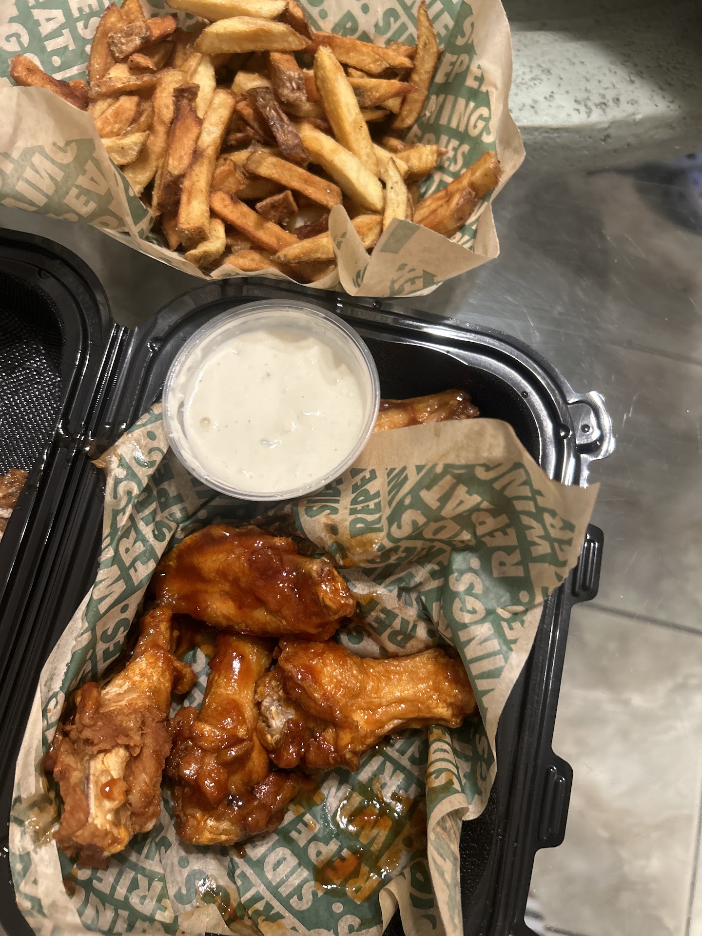 Wings are good, BUT they nickel and dime you with the little tiny cups of dressing! Most ppl dip their wings in ranch or bleu cheese and ONLY this restaurant chain charges extra for a little tiny plastic cup of dressing. I get that condiments cost them money, BUT that’s equivalent to McDonald’s charging for ketchup! It’s a ridiculous up charge. The wings are expensive enough. Also, since the food took a while (which I don’t mind if it’s made to order) BUT I think they should make the fries last, or at least a few minutes after they start the wings. By the time my wing order was ready, the fries had been at the bottom of the bag for several minutes. Needless to say fries were Very cold by the time I...