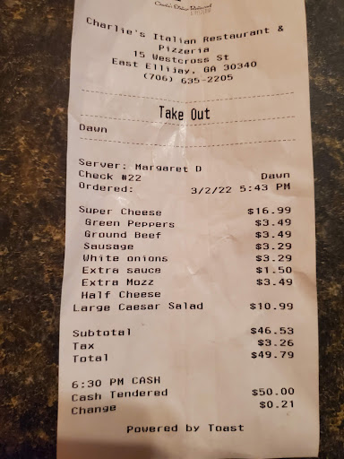 Read moreWe are in the Ellijay area fairly often. My wife has said for a long time she would like to try this place but for whatever reason we never had. On this particular day we decided to. It was a Friday evening around 6:30.We had no problem finding a parking place(which probably should have been a red flag).We entered and was greeted promptly and was seated right away in the Bar area. The bartender was who took care of our servicing.... which is the norm in a lot of restaurants. She did welcome us and take our order after about 10 or so minutes. The restaurant was not even close to busy. We placed our order...a very simple one that was Spaghetti with meat sauce, salad and the Charlie's signature specialty Pizza.We had Fried green tomatoes as an Appetizer. It took around 30 minutes to get our meals. Longer than you would expect but it happens sometimes.We were told at about the 20 minute point that we were waiting on my Pizza to cook. Ok.. that's all fine. Here is where the main problem lies... The food was NOT up to par. The over $20 signature pizza was not thoroughly cooked( very doughy in the center) and the flavor was very bland. The Spaghetti dish was for sure not a $15 or more dish. Very minimum effort put into it with products that were not even at the Wal Mart level of flavor. The Appetizer was ok and the sweet tea was probably the best thing they served. My wife's salad was never brought to the table... not sure why. Our server was polite and friendly but seemed like that she could have used someone to help in her area. Wrapping up...I was disappointed over all especially with the taste compared to the price. I would suggest the cook and maybe even owner visit other Italian restaurants nearby and compare prices and quality. Maybe Papa's Pizza House in Jasper or Marie's Italian Deli and Bakery in Cumming. Their costs are lower yet their food is just simply put much...