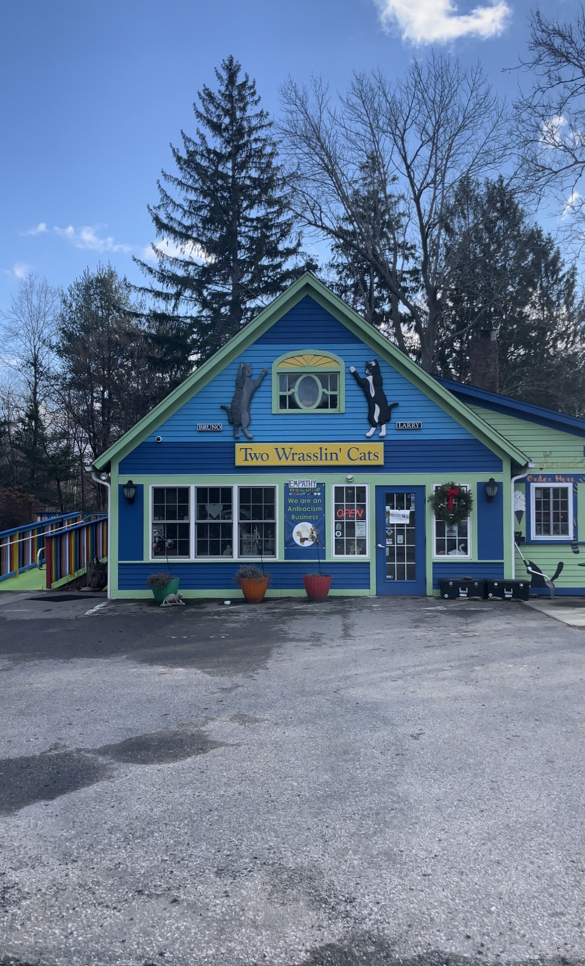 Read moreVery disappointed in the treatment I experienced while dining at 2 wrasslin cats. I have been there multiple times before with my service animal and everything has been fine. Today, 3/19/23, my school was promoting our drama club with a bake sale outside. I entered to order some food, the women took our order, very kind, told us we could go make ourselves comfortable and she would find us when our order was ready. When I turned to head towards the seating area, the owner, Mark, walked in and was immediately very confrontational towards me. He told me I could not pass the counter area to go towards the seating area and had to sit outside. I have sat indoors with my family on multiple occasions with no issue. He told me it was because he didn't want to stress out the cats. I was not going to go anywhere near the cats and they are closed off in a separate area that I was not going to enter out of respect for the cats anyways. He told me that he couldn't have dogs in the building when the dog is my task trained service animal that was completely under control and well behaved. He claimed it was in case my dog barked, which would not happen as he is a very well trained, well behaved, medically necessary service animal. We have 2 cats at home that coexist with my dog just fine. I was not going to go near the cats anyways. Many people can vouch for my service animals behavior as we live in town and he attends school with me. The owner, Mark, has met my service dog before and never had an issue with him accompanying me. My dog calmly lays at my feet and does not cause any form of disturbance. I find it odd that a business that promotes positivity and equality would discriminate against a disabled person and their medically necessary service animal. I will no longer be supporting 2 wrasslin cats based on their behavior towards me. I no longer feel comfortable or welcome at their business. I am saddened as this has always been a place I have enjoyed dining at. I understand wanting to give your cats space, and I was going to respect that, but you also need to accommodate disabled people as well. It is illegal to discriminate and kick out a person with a service animal and ask them to sit outside, especially on a cold morning when it is 28 degrees outside. My dog was under control and behaved, as he should be. The only legal reason to kick out a service animal is if they are not under control or behaved, are aggressive, or are not potty trained. If this business has any more questions about service animals I would be happy to educate to ensure an incident such as this one doesn't...