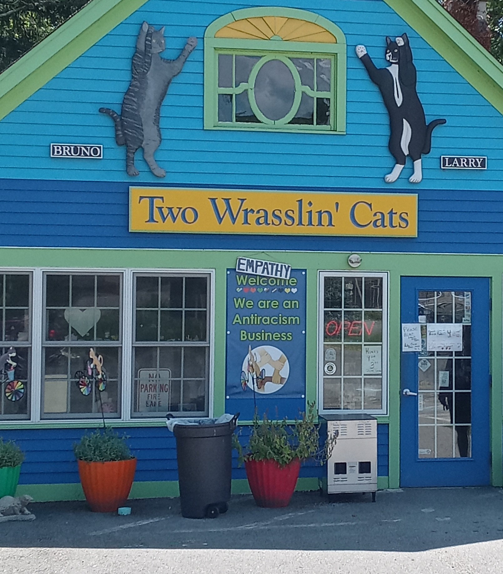 Details: Upon approaching from the intersection the first thing you we noticed was a banner with a Harvey Milk quote with dripping rainbow lips below it. As we approached the door on the left side is a large commercial coffee maker just outside the door (see photo). There is a hand written sign which does not stand out that states there is a limit of four people in the ordering area which is funny because unless you enter the number inside is unclear. We opened the door and were met with the person behind the counter telling us the limit. I had my family wait outside while I stayed to hold our place. The ordering area was cluttered with cat items, t-shirts, pictures, knick knacks, and hand written signage. It was impossible to tell what was for sale and what was on display. As I was standing inside numerous people tried to come in but were told the limit. I am still trying to figure out why they were enforcing the limit while at the same time non of the employees were wearing a mask. My family was finally able to come in. They ordered cat themed food and then we headed to the back dining room. We sat around a circular table towards the back. The chair I sat in was on the side with my back to the live cat display doors. The arm on my chair was broken so it swayed side to side. There were cat items of every type, swinging from the ceiling, placed on a shelf, and framed. On the wall to my left were two framed pieces of toast and a framed board that displayed multiple cat fur balls that had been coughed up. On my right was an alcove with a bathroom on the left and an out of order one on the right. Behind me were two glass doors where you could watch five playing cats. In front of me was a bar like area with stools. Underneath the bar were boxes and items all crammed from the floor to just under the bar. After a few minutes had passed a group of eight teenagers sat behind my son directly in front of me. Our food was brought out from a door on the left of the hairball collection. The second the door opened a strong smell of ammonia filled the dining room. The longer we sat the more we noticed our surroundings. There was a sign telling people to clean the table and seats before and after we ate. After my family was done my wife asked the girl up front if we could see the cats. The girl brought us over to a gentleman named Mark who was in a chair reading. Mark put down what he was reading and told us to meet him outside. He asked us to follow him to a door that was on the side rear of the building. He let us in and told us the rules. Mark began to tell us the cats names but he seemed to struggle to remember them. We patted the cats that all had oddly long noses. The room had tunnels and a scratching pad boxing ring. My wife noticed to the back were five empty food bowls. She also noticed holes in the wall with kitty litter around them. We assumed that is where the kitty boxes were. We let ourselves out and walked to the outside yard and took pictures.