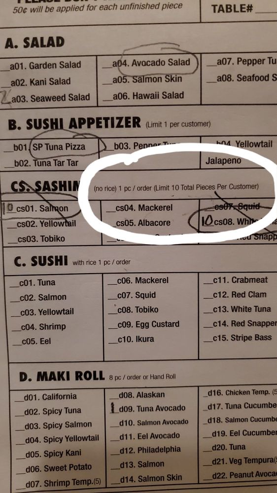 If you are looking for a real ''ALL YOU CAN EAT' Japanese restaurant then you are better off going to NAGANO JAPANESE RESTAURANT in Morristown or SUSHI PALACE in Summit - both charges $25 for 'all you can eat' per person with the exact same concept of filling in a menu order form which is a dollar more than this FAKE 'ALL YOU CAN EAT' Japanese restaurant in East Hanover. Sashimi and sushi appetizers are limited and can only be ordered with a limit per customer during your entire meal. Sashimi has a 10 pieces per customer limit during the entire duration of your meal.