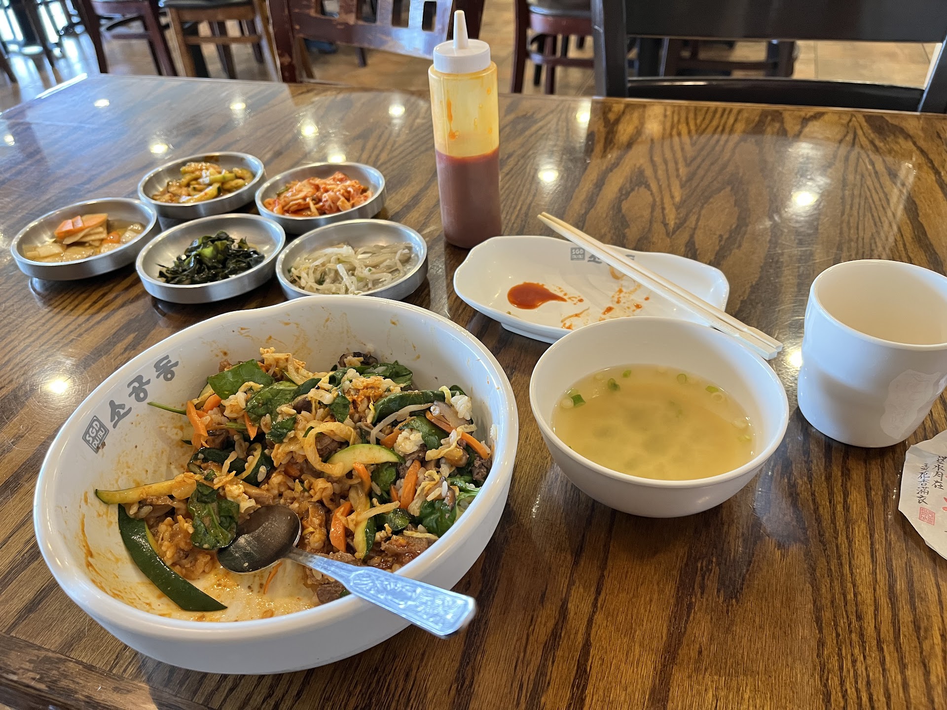 Read moreFirst time, and sadly, also my last. I love Korean food but this was a disappointing lunch. I visited as they had just opened for the day, and the only persowas still swiping the floor, so at least they keep it clean. I got seated fairly quickly, and my order got taken promptly. The person taking my order, however, appeared robotic: no welcome, no smile. I initially ordered the bibimbap, but when i asked to upgrade it to come with a stone bowl just a minute later, he told me it was too late to make any changes. OK - not an issue because warm bibimbaps taste okay too, right?! Except, when my bibimbap arrived 12 minutes later, it was cold. The "miso soup" which accompanied it was also cold, and was the worst tasting standard-issue miso i have ever had (not enough paste, under salted, slimey kelp anyone?!). The banchan were equally underwhelming: the carrot & raddish had browned edges and were not crisp (although the seasoning was OK), the kelp smelled beyond expiry, the cucumber were over cooked and slightly slimey, the soybeans were under-seasoned, and the kimchi was average: not good but not bad either. My bibimbap, you ask? Besides being cold (not even room temperature), sadly the establishment forgot to incorporate any sesame oil whatsoever --- none of the veggies were sauteed in sesame oil, the baby spinach was in fact raw, the egg was cold, the overall lack of seasoning (despite my dousing it in gochujang!) made for a not-so-pleasant meal. Sadly, the most underwhelming Korean food i have ever had. Coupled with the lack of service, i'm still giving it a two star for cleanliness. I wont be back, and...