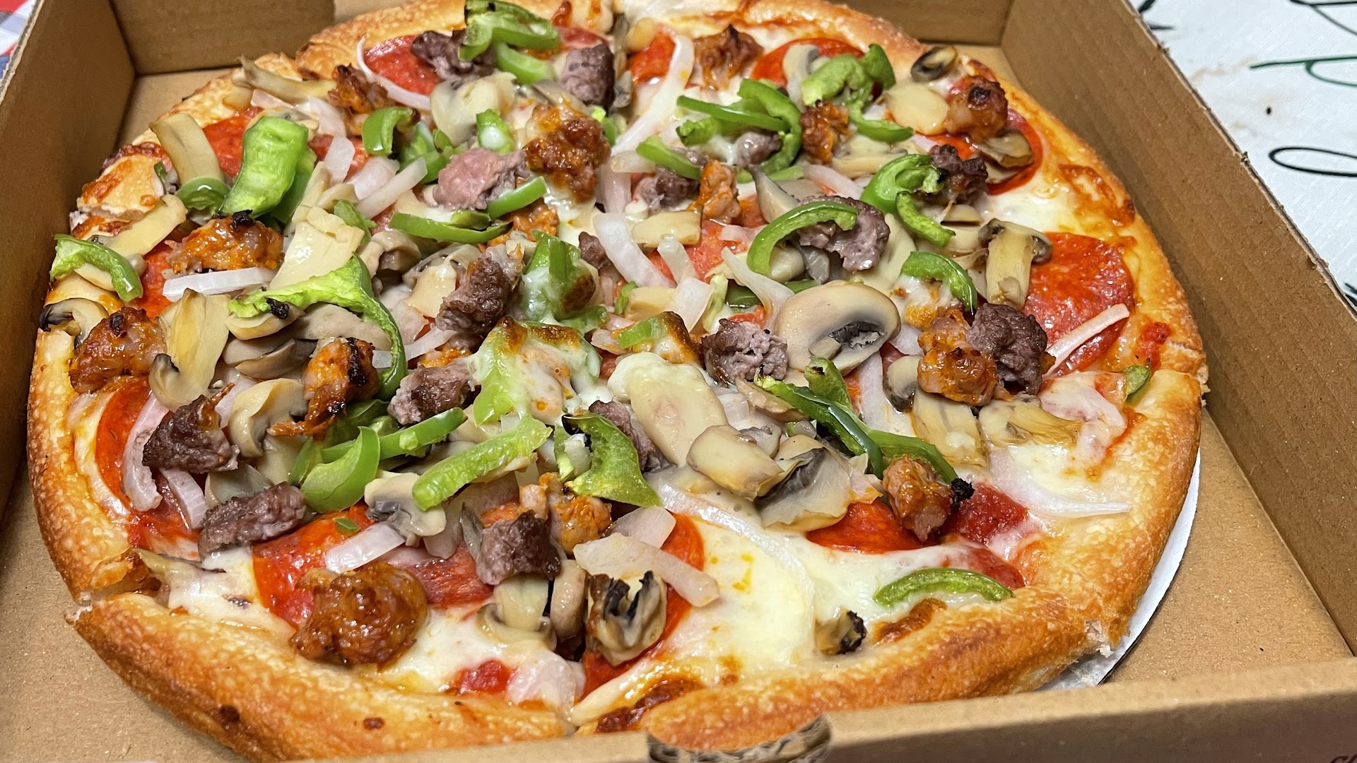 We were first time customers last night at C&E Pizza. I ordered a large meat lovers pizza with no ham and onions. I found it to be quite good. The crust was not super hard. It was also not black at all on the bottom from what I could tell.The only thing was a little skimpy on sauce. There were spicy bits at times not sure what from maybe the sausage? My wife enjoyed the spaghetti with mushrooms and sausage. I was surprised when I was going out the door when the owner? He hollered to come back which I did. I thought there was maybe a problem with my credit card but there wasn't. He gives me a bowl of what I thought he said was ice cream. It was not it was rice pudding which my wife enjoyed. I think he heard me telling his son we were first time customers. It came to around $44 or $45 not too outrageous these days for a large pizza and spaghetti dinner. We will be getting dinner there...