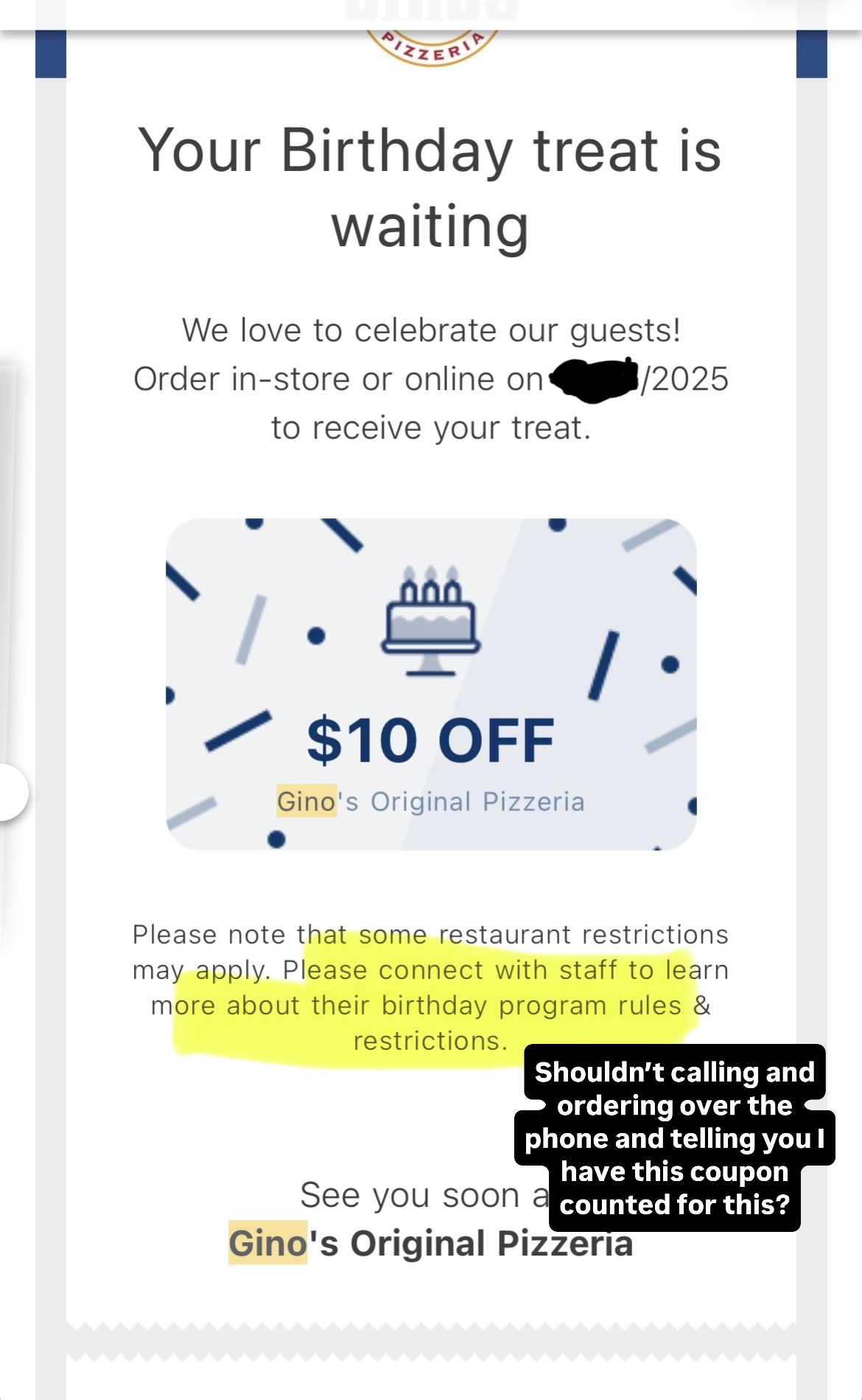 This year I went to use the birthday coupon again. To begin with these greedy people took it from $20 off to $10 off. Ok whatever it is still a deal even though that is a disgusting amount to reduce it by when the prices are already inflated for this type of food. I looked over the entire email and no where did it say there was any restrictions just a bit about it might vary contact the restaurant. So I make sure to call to order so I can speak to a staff member and tell them that I have this coupon. After I tell the girl my order I let her know I have the coupon. She responds with another new change this year that was not there last year and that was if I had not ordered in 90 days I might not be able to use the coupon but she needed to ask the manager/owner and put me on hold. This was not a short hold either so they definitely were talking about something. When she comes back she says she is not sure but I can come in and they will take care of it. She tells me it will be 35 minutes. I wait the 35 min and go there. When I go to pay I show the coupon and the girl gets another woman. This woman says oh no you have not ordered anything since January you need to have ordered in the last 90 days to use this coupon. KEEP IN MIND Gino's sent me this coupon in my email one day before my birthday. I have used this for at least 2 years prior without ever hearing this. I even called and spoke to them IN PERSON and they still had me come down there and waste my time just to play in my face when they could have checked this over the phone. All she did was type in my number. Which according to their own insane policy should never have even been sent to me since it had been well over 90 days since my last order.
