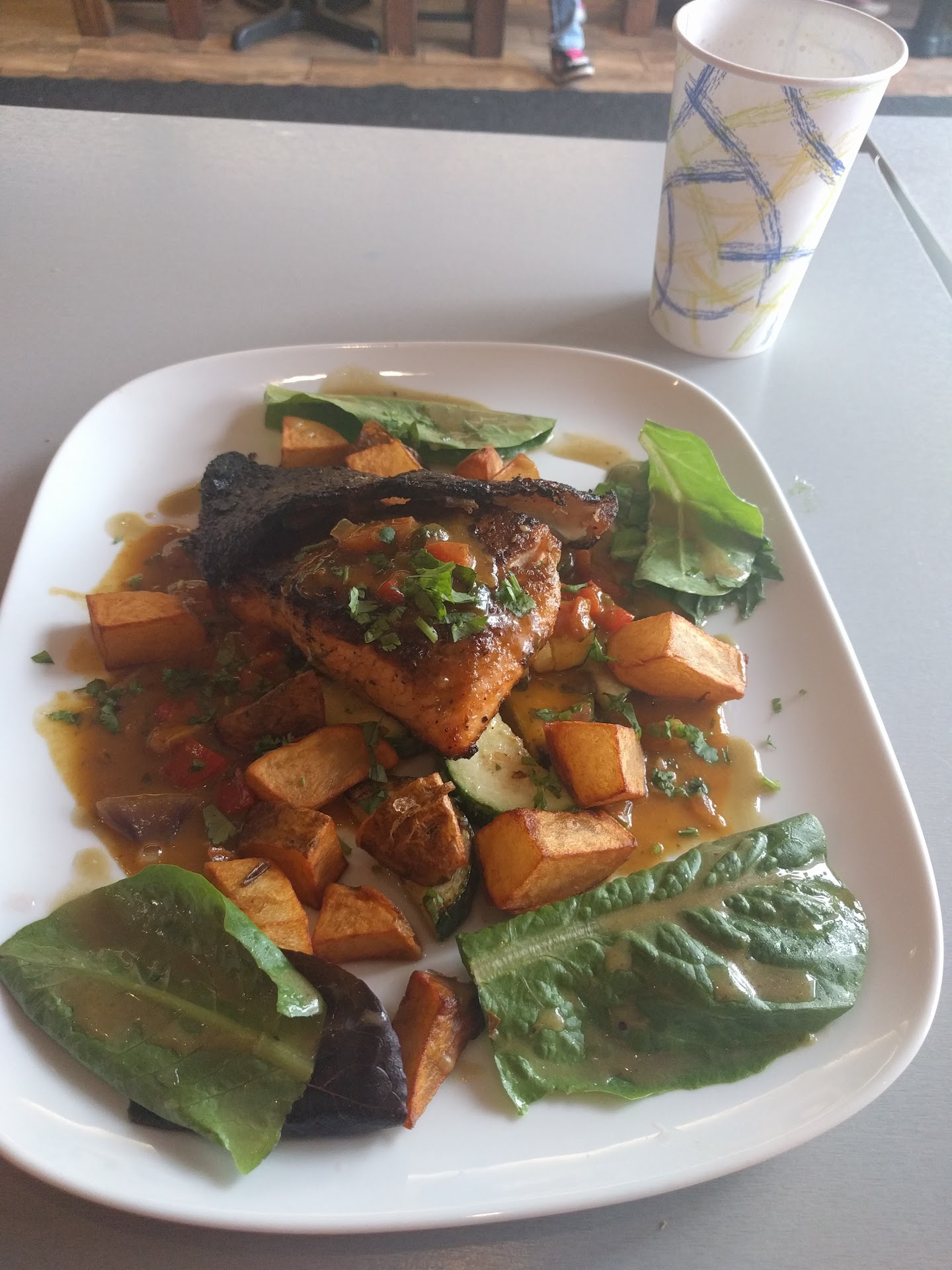 I accepted but was not too excited ... I have salmon a lot and it is far from my favorite However I took a seat. Out came the meal (photo attached) that exceeded all expectations. The salmon was crisp on the outside but wonderfully moist inside...medium rare...the perfect way to taste salmon (for me). There was a light tomato sauce ... Just enough for taste. The roasted potatoes were similarly crunchy on the outside yummy in the inside. I was in heaven.