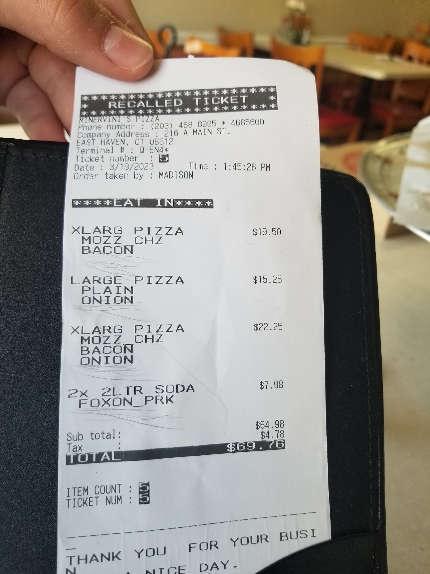 I would recommend Minervinis to anyone in the East Haven area. They DO have online ordering, but it's better to just call, the 35 min wait time does NOT account for things like lent, snow, or anything else that would create a surge...