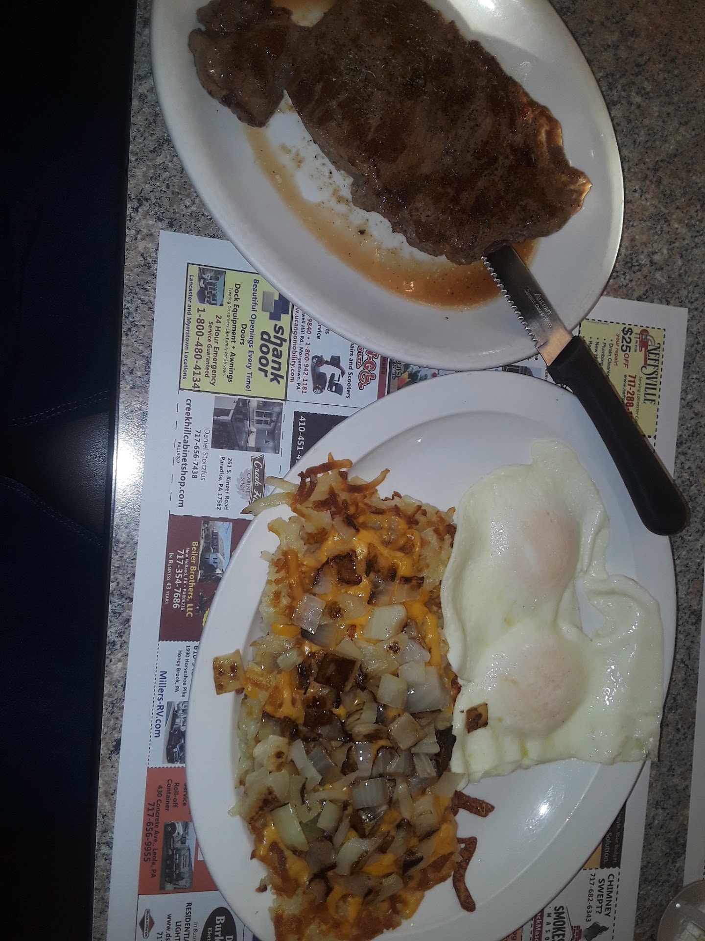 I decided upon Chopped Steak, grilled to perfection served along with shredded potatoes and fluffy scrambled eggs. I declined the bread as I'm trying to watch carbs. I also ordered a side of scrapple, extra dark with horseradish on the side. Everything was absolutely delicious.