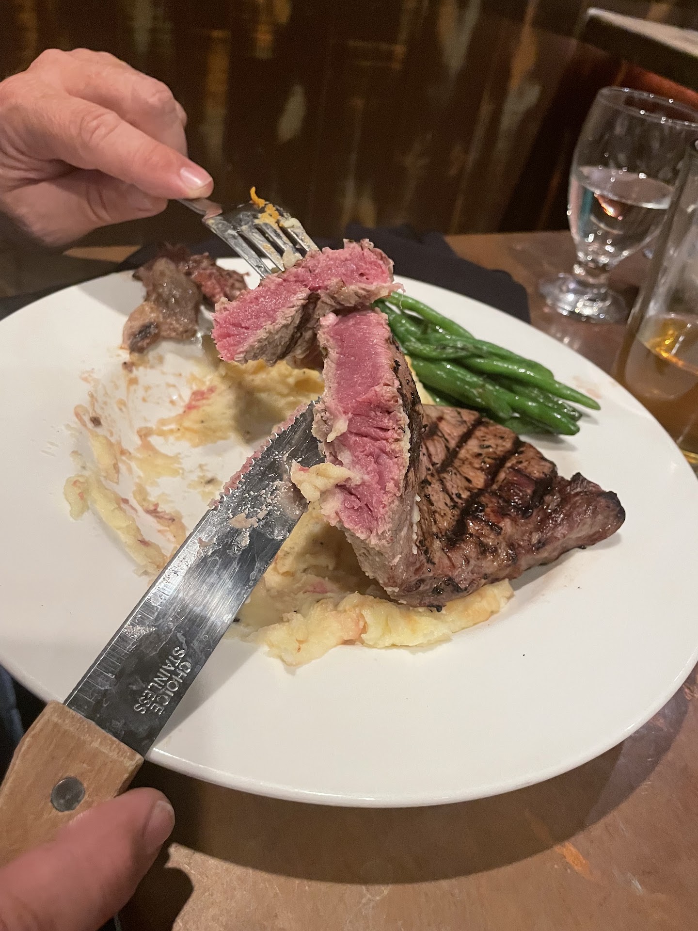 Finally figure out what I'd like to eat! We get apps that were great! My son got the mushroom Ragu and it tasted rancid and just cheap cooking wine. He sent that back and got a Alfredo flatbread came out super quick and he liked that. My husbands rib-eye delmonico came out well done not med rare like he asked! And had the asparagus and sweet mash like he asked! It's was like all the hot food was sitting under a warmer for wayyyyy to long! The steak went back 10 or so mins later his new steak came out super rare (pictured below) and next photo is the insane amount of gristle! The steak was $34 I mean that's a lot to have that come out! The steak was also sent with regular mash and green beans not what he asked for. My moms shrimp dish was also supposed to be served hot and was lukewarm warm at best! The salads looked good that my other family members got! Guess I should stick with salad. The server was kind and helpful, but seemed super busy and we had to wait for drink refills but she was good!
