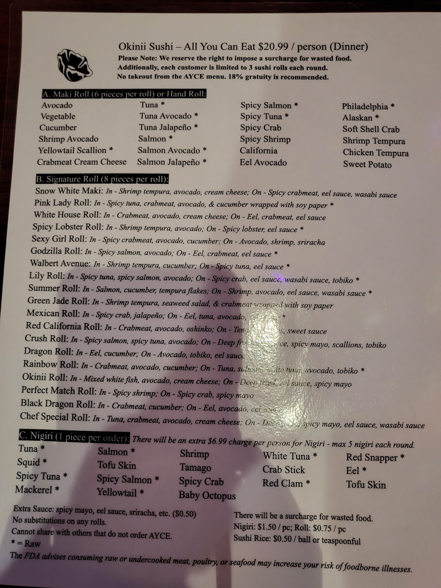 Firstly, when we entered we asked for both regular menus and all you can eat menus. We were then told that we could only do one or the either, not both. This was never the case in the past.