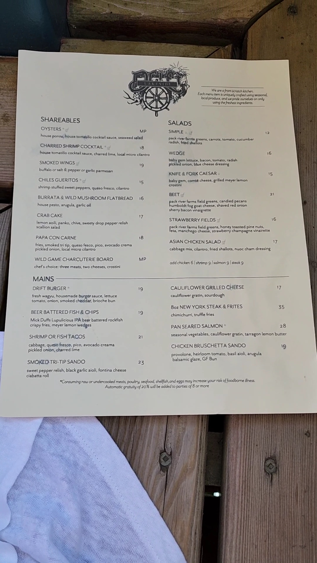 Ā Ā Ā Read moreDrift Lakeside is in a location that my family and and I have been dining at for years - we just didn't know it was there! The previous owners closed down a year ago, and even in this super-small town, where everybody seems to know everything about everyone, this restaurant has escaped notice. This is especially odd since it's one of only two restaurants within 15 miles in any direction that stayed open in the winter. (Note to management: promote yourself, you deserve it!) The facility is beautiful, the views are amazing, the staff was super friendly. Only had the happy hour menu, so I can't really testify to the quality of the full menu, but what we had was very good. ...