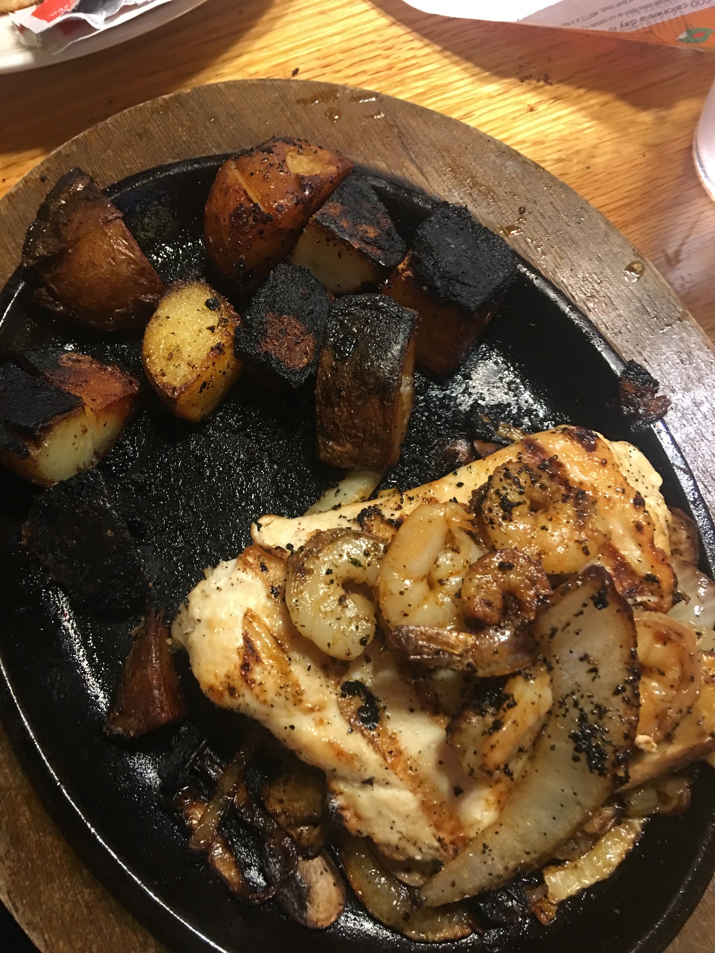We ordered Mozzarella Sticks and Neighborhood Nachos with Beef. About five minutes pass and our server took our entree order (still no problem with this.) I picked the 8oz sirloin medium with garlicky green beans, and fries, my wife got the Bourbon Street Chicken and Shrimp. About 10 more minutes pass and now our drinks are low and we still haven't received our appetizer order. The server comes up at this point to tell us that there was no beef available for the nachos. (15 minutes after the order was placed? Unacceptable!) She refills our drinks at this point. Another 10 or so minutes goes by and the mozzarella sticks finally come out. (Guess what? They weren't hot, only warm!) We just about finish the mozzarella sticks after about 5 or so more minutes to have our server let us know that they didn't know what happened to our nachos, but they were having them remade.