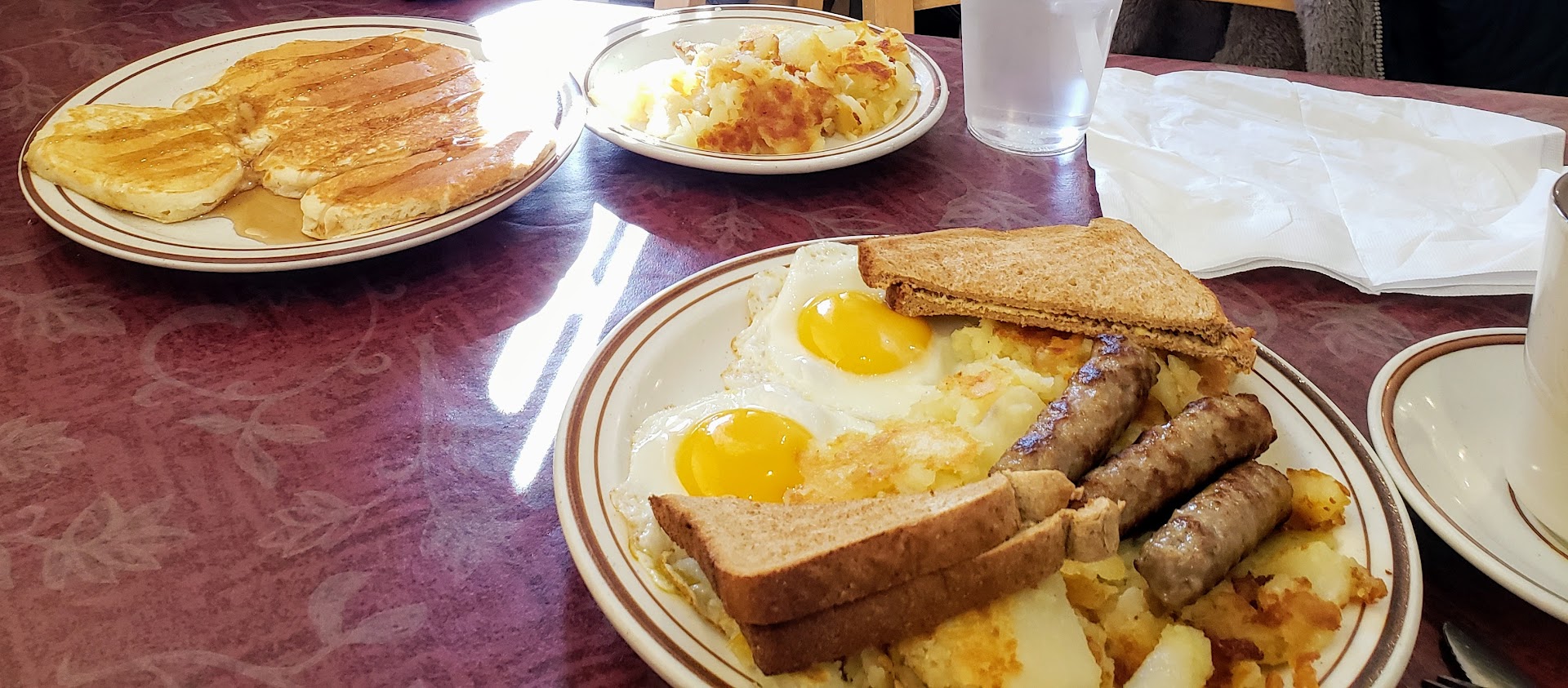I went here with my son, and we both loved our meals. The $4 kids meal is an excellent value. It includes a micky mouse pancake (fills a 9" plate to the edges), two strips of bacon and an egg. I got the Greek omelet and it was well prepared and came with a reasonable amount of potatoes and two slices of toast.