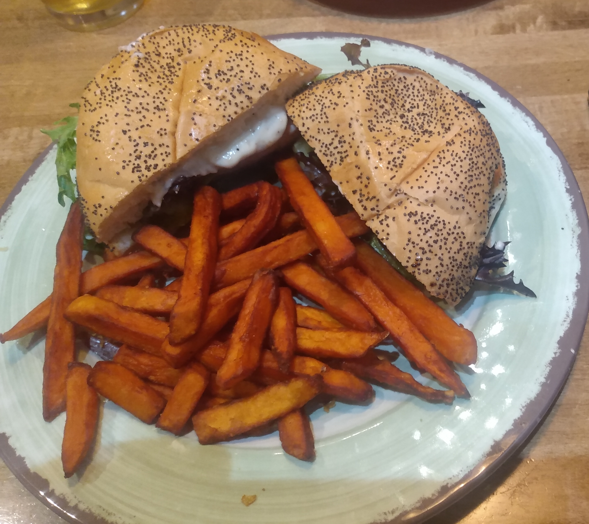 The fries. Over-cooked outside, soggy inside. Sweet potatoes are a pain to fry. You really have pull the moisture out of them to get them to behave like potato fries. Management, why did you remove the process steps required to properly dry sweet potato fries?