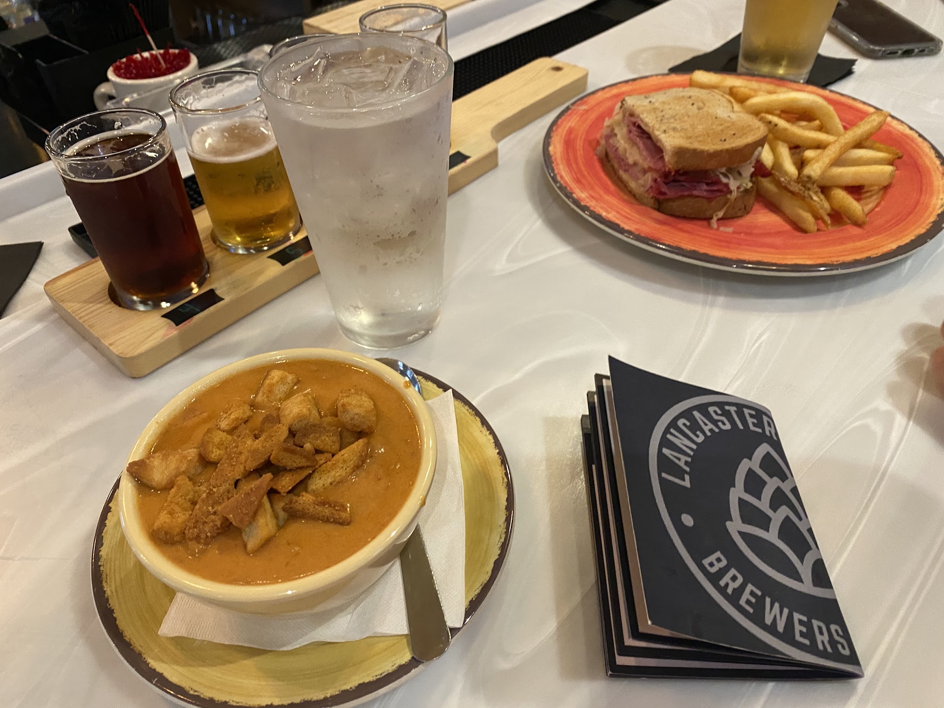 This review gets two stars instead of one because of the service staff. I've been a server, getting a poor review from a customer in person is a gut punch. The waitress answered my concerns honestly, and took fault for leaving the rags on the counter. That's professionalism. As a customer, watching a server have to explain away her management's shortcuts is heartbreaking and frustrating.
