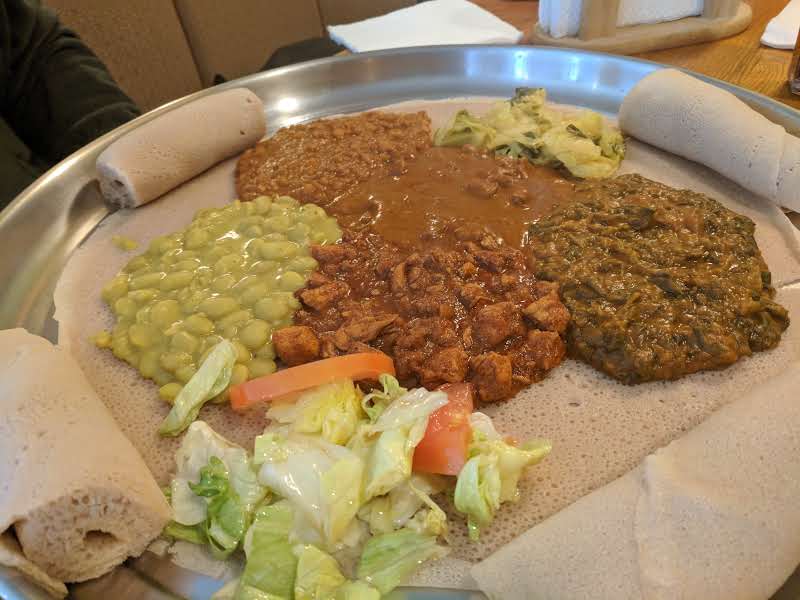 When I come for lunch, I like to get the lima bean lunch special and a smoothie. The smoothies are made without dairy, but they do have honey in them, so if you're vegan you'll have to ask them to omit it. For dinner I like to get the sample dinner platter, which is a combination of any four dishes. I think the spiciness of the hot dishes are perfect, but they have been a little too hot for my friends and family. While you cannot get an already spicy dish made more mild, you can order a mild dish and ask for them to add a little heat. I love the cooked greens, lentils, chickpeas, and lima beans. For lunch or dinner, I always prefer the injera bread (which is gluten free) to rice. It's fun to tear and scoop up your food! I think the portion sizes are good; you definitely get a lot of food!