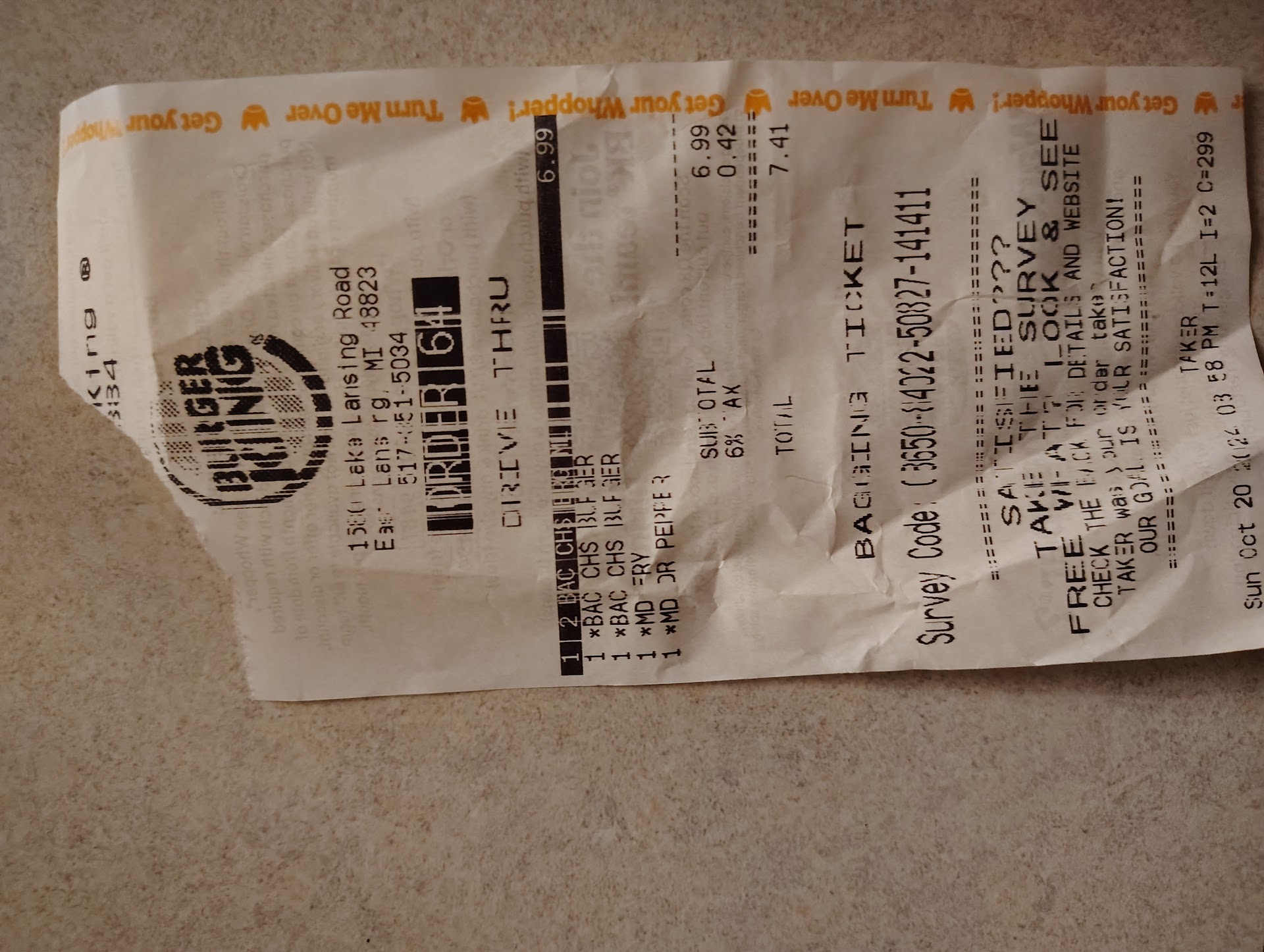 Read moreWe walked in and after a few minutes, the cashier said she would be right with us. She then proceeded to wait for a drive-through order to be completed by the cook. She had plenty of time to take our order in the meantime, but she didn’t. After a few more minutes, she then came up to us again and said that she would be right with us. She then went back to the drive-through window and started a brand new drive-through order. She had plenty of time to take our order while she was waiting for that first one to be done. After she started taking the second drive-through order, we lost it and left. This person obviously doesn’t have basic entry level skills. Now tonight, my friend said he went through the drive-through at that same Burger King and got a burger and said it was gross and he threw it out, so this is a Burger King I would avoid it all costs. I think corporate needs to know about this place. It is not being...