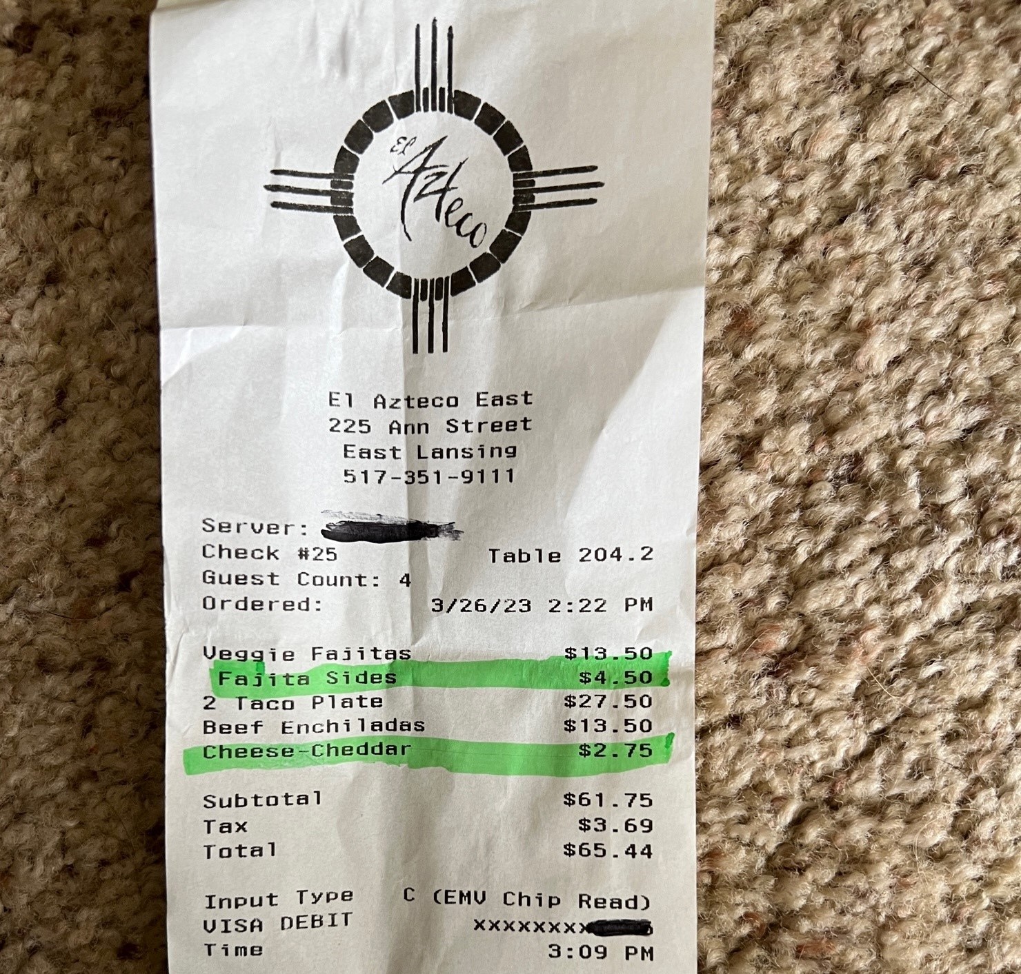 Read moreVisited the East Lansing location for lunch on March 26, 2023 with my family of 4 . We heard great things about the service, food, and location from friends so decided to make the drive from Kalamazoo. Location was great, lots of shopping in local businesses, coffee shops, and even a target. Food was mediocre, at best. Beef tacos didn't seem to have much seasoning at all. Chicken tacos were not bad, meat was moist and seasoned. The one recommendation I would caution folks visiting this eatery would be to tread cautiously as this location will gouge you with upcharges. I am OK with upcharges but some items need to be standard with the meal. The server was quick to ask if I would like the fajita sides (lettuce, sour cream, and cheese), unknowingly I said "yes", not knowing that what should have been a staple was actually 4.50 extra. The server didn't mention there would be an upcharge. The amount of cheese given on the fajita side was about a spoonful, and of course the upcharge was 2.75. I understand upcharges but come on $7.25 for items that are a staple of meals is a little over the top, and if there are upcharges then at least mention that to the customer. Also, asked for a detailed receipt and the server looked a little confused and seemed reluctant "I can get it for you but it prints in the back"...... I asked to talk with a manager, and they were in "interviews". Would not recommend this location and if you do eat there be cautious of...