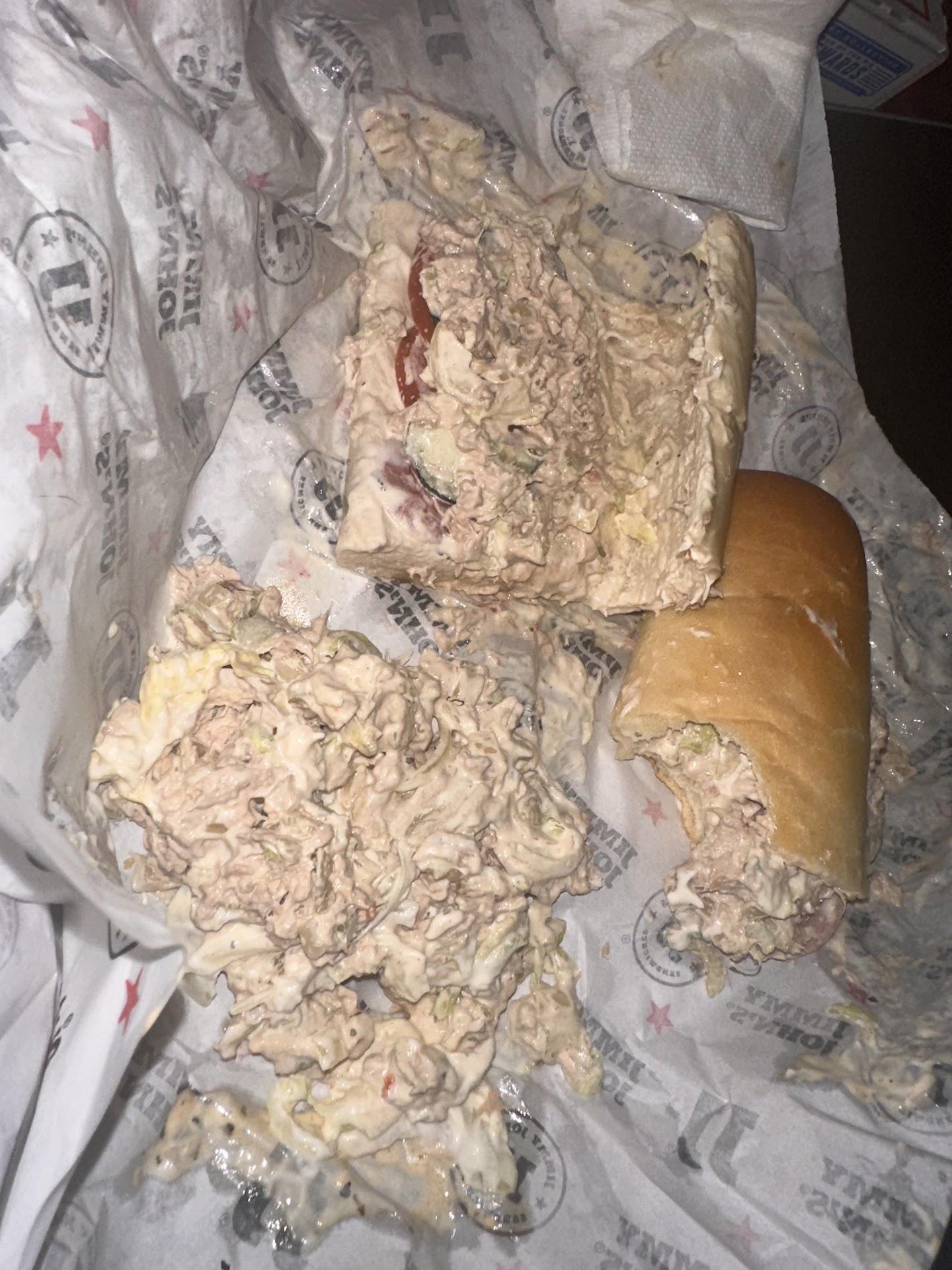 I get the same thing all the time at every jimmy johns and Iâve never had it be so sloppy before. Feels like there was double amount of the tuna as normal. While some may consider this a good thing, I actually wanna taste my other ingredients which is hard/impossible to do when the sandwich tasted literally like they just put a bunch of tuna and mayo in some bread and called it a day.