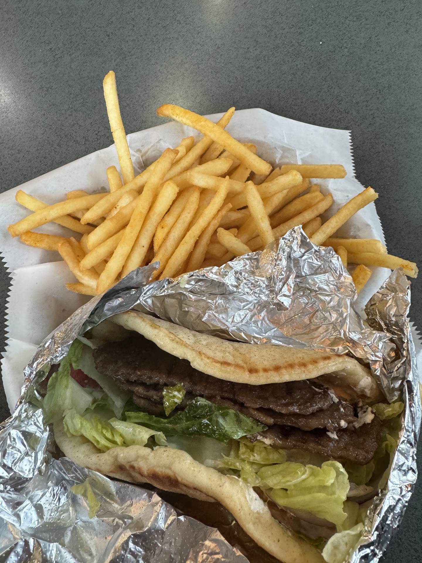 The gyro is the best thing I've eaten there, even though it's not close to being the best in town. The chicken strips are actually processed chicken meat, something that seems unnecessarily cheap (I mean, even the dumpiest bars will serve actual cuts of chicken breast for their strips).