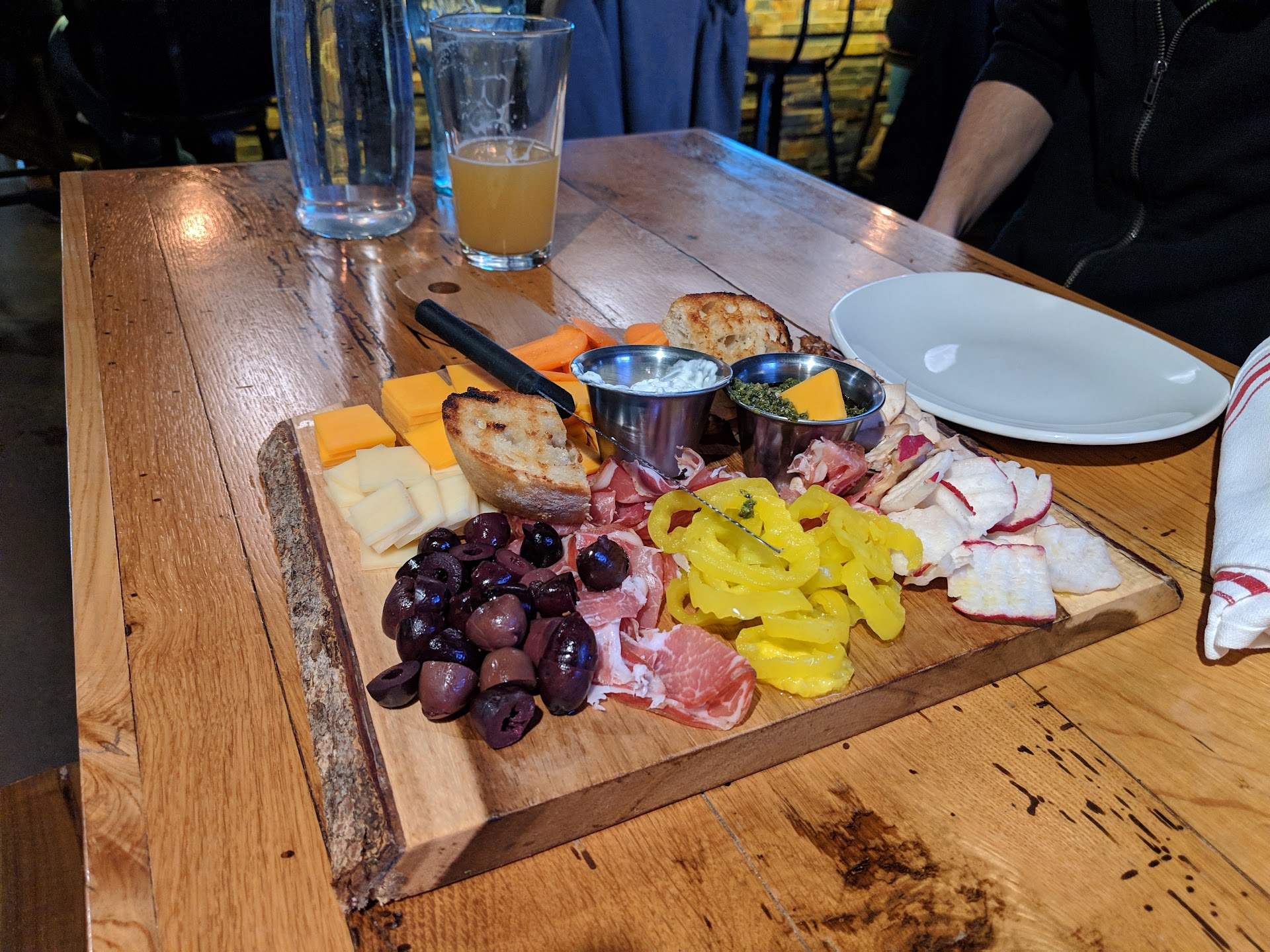 I don’t even now where to start. Our attempt to have dinner at this bar was most chaotic and underwhelming. Party of 4 arrived at 5:45pm on a Tuesday. We found a table, were greeted by Sophie who took our drink and appetizer order. After the wine arrived, it all fell apart. We asked for waters that were never brought to the table. The bruschetta was lukewarm and mediocre. The food orders we placed were double checked by the waiter and still came out all wrong: steak was advertised as being served with a salad, mashed potatoes and asparagus; it arrived 45 minutes after we ordered with no salad or potatoes. Instead, it arrived not medium rare but well done and when asked about the potatoes, the food runner shrugged her shoulders, said she was not a waiter, and left. Another person came over with a plate of what looked like rice and more asparagus. Confused, we asked what that was all about and the answer was “the rest of your order”. As for the other entrees, the two salads were okay but again, orders were wrong: salmon was supposed to be grilled and was blackened, dressing on the side was not served. Lastly, the pasta dish was brought out in a take out container because at this point, after waiting for almost one hour, we were done. Pesto pasta was all clumped together, lacked seasoning, and the shrimp not blackened but barely thawed. And no side salad. All this to say the food was terrible. The service was unprofessional. Our waiter disappeared the moment we asked why it was taking so long, given that restaurant had empty tables. The bartender who dropped off the food literally slammed the plates on our table and asked one of us to leave because we were being loud. We asked for boxes, the check and a manager. The boxes took forever, the check was outrageous, and the manager… well, there was no manager in duty. When we finally got the check and walked to the bar to pay, a manager showed up and was about to comp our tab after being explained what we had experienced. And then, the snooty and entitled bartender told him we had yelled at her and we had no choice but to hand them the credit card. No one, and I mean no one at this establishment knows what they are doing. I think there was only one waiter, two disoriented food runners, one grumpy bartender who acted like a manager, and who knows how many cooks. For the prices they charge ($12 to add salmon to a salad, $54 for the leathery steak, $65 for a charcuterie board), one would expect much better. Never again will we set foot in this place. Sometimes one or two things aren’t perfect and that’s okay. This was a nightmare, everything went wrong and there was no attempt at fixing it and no apologies offered. And if you care, they don’t card anyone. Great...