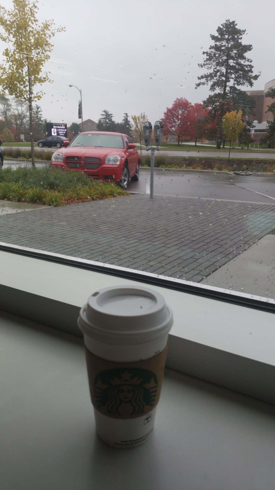 Can't give this Starbucks a good rating because 1) the parking is expensive. A quarter only gives you 10 minutes and if you don't have a lot of change you will get a $10 ticket as I did 2) there are absolutely no comfortable chairs and there is little seating. It is a tight fit. Not a place to go to to meet someone or work comfortably 3) like all Starbucks it only has little packets of real sugar instead of sugar pourers but this one was even out of that and had to be requested 4) they apparently are also out of hazelnut syrup and don't know it as a first and a second request ended up without both times. Biggby's has them beat in the Lansing...