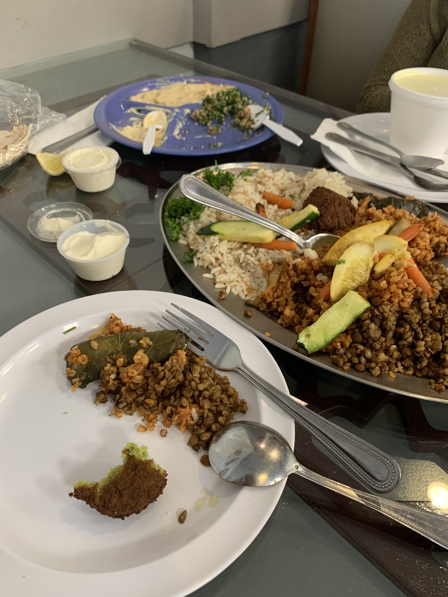 Honestly this place was awful from the moment we walked in. The hostess was extremely quiet and barely talked at all. Once we were greeted, our waitress dropped off our drinks and said she would be right back for our orders. We placed our order, my wife got a vegetarian grape leaf wrap with a fattoush salad and I got a chicken shawarma wrap with crushed lentil soup. The soup and salad were dropped off, both were good but definitely were the most sub par we’ve eaten compared to other middle eastern cuisine. Once our food arrived my wife’s order was wrong and they made a lamb grape leaf wrap rather than the vegetarian and my chicken shawarma has bones in it. They remade my wife’s in a fast manner but I asked if I could just switch to a vegetarian grape leaf wrap as well, our server said no problem at all, and after waiting a while for the replacement wrap, another chicken shawarma was dropped off. Our waitress then apologized and said the whole meal, everything was on them and it would be free, only to still charge us. If I could give this place a negative star, honestly I would. Save your money for gas and go to a better Mediterranean restaurant like Zaytoon, Taboon or La Marsa, even if you have to...