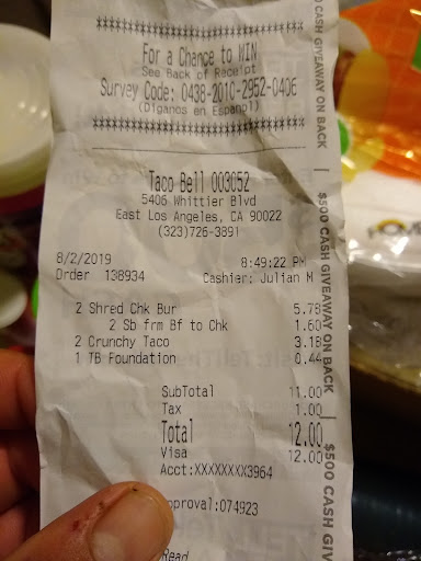 Ā Ā Ā Read moreDuring my visit I was served by an attentive crew. The cruch wrap supreme meal that I ordered was made very well. The food wasn't just thrown together and rung out. One of the employees even took the time to assist an older gentlemen struggling to come through the door. The interior doesn't look half bad either, it was clean and organized. However, being located directly on Whittier Blvd this Taco Bell is a magnet for homeless people and occasional weirdos. During my hour in the restaurant about 3 different homeless woman dropped in, some hanging out outside the restaurant. The staff however, was professional addressing those people. It isnt the restaurants fault, but it does spoil your eating experience a tad bit.