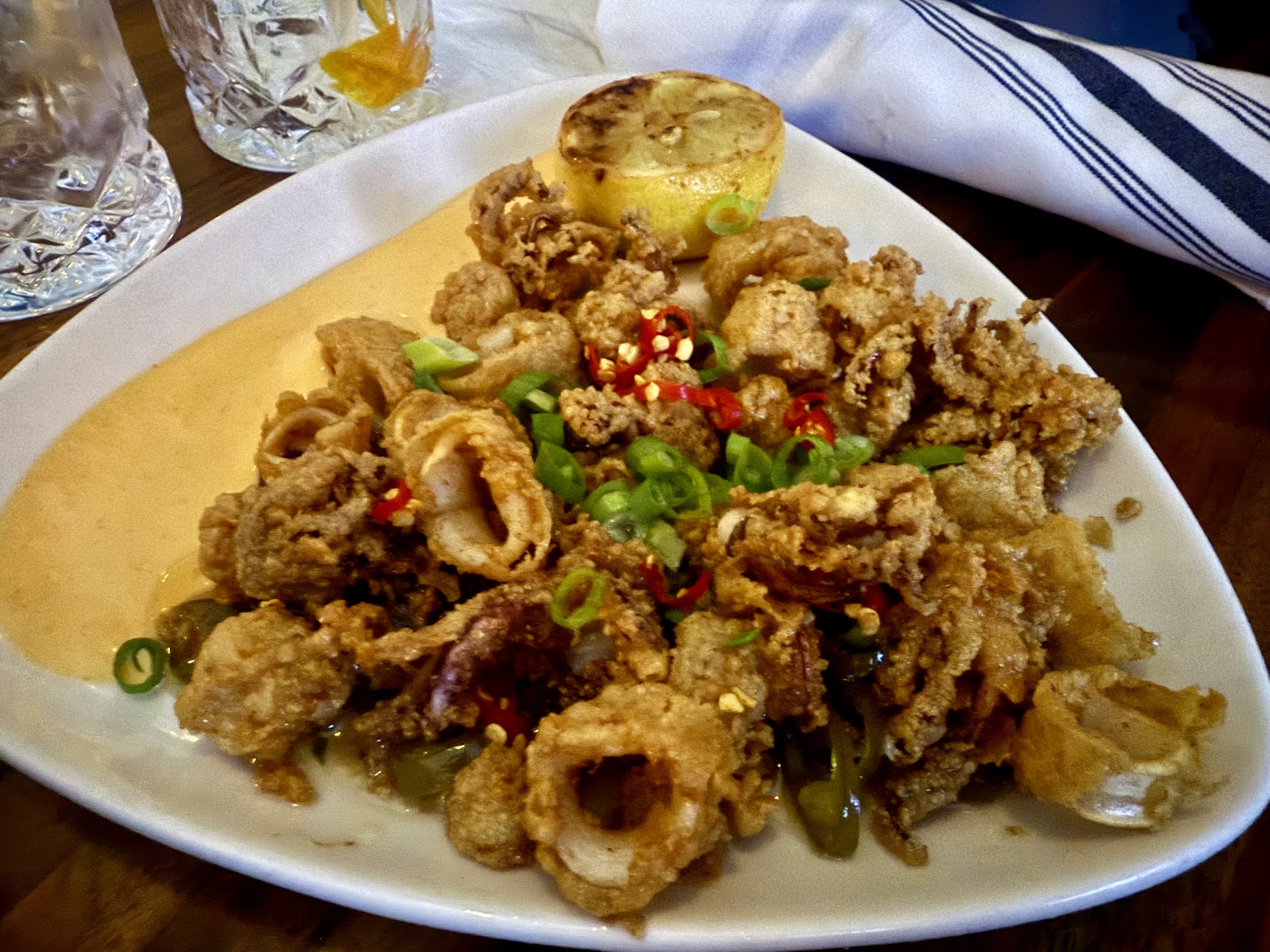Calamari â Fried squid with sweet chili sauce, sriracha aioli, and green onion. This was the best of the bunch. The flavors worked, but the execution was off â the breading didnât stick well, and the squid was slightly overcooked. It had potential, just felt a little rushed.