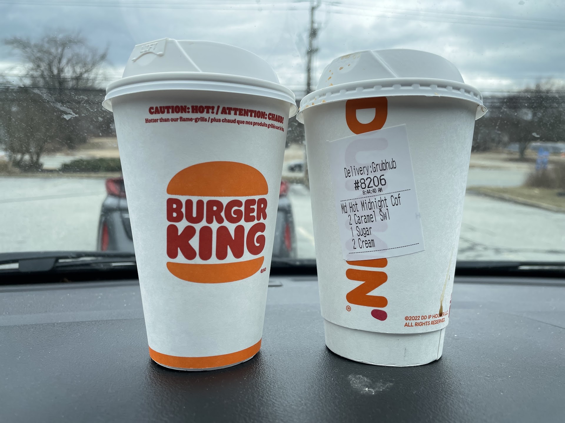 The picture is a Burger King ālargeā coffee compared to a Dunkinā āmediumā coffee. She said they donāt have any larger cups, which must be new because Iāve had a large coffee before.