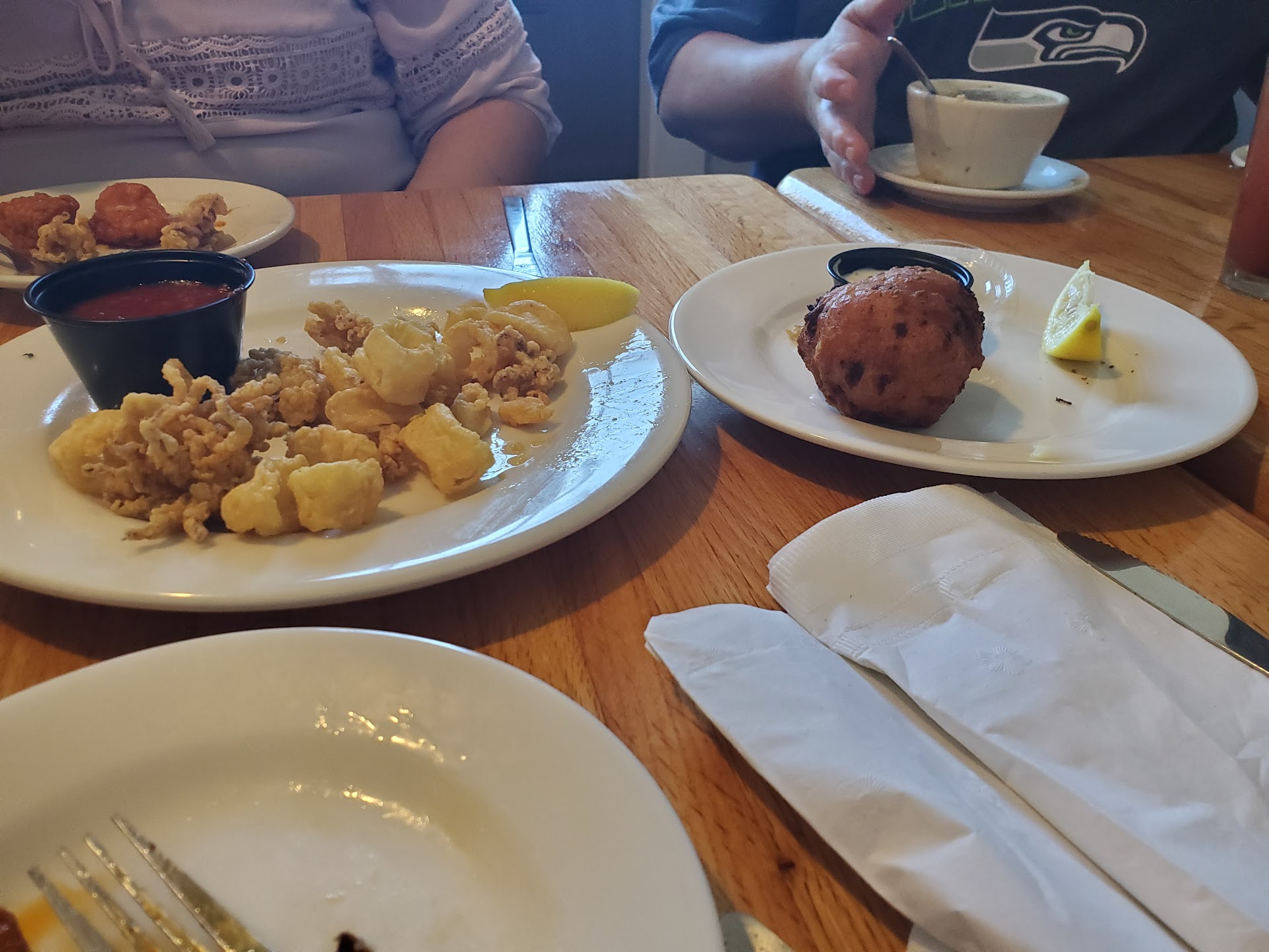 When we got seated we ordered appetizers. Calamari, calm fritters, and shrimp and swordfish "wings". The calamari was the best calamari that I've ever had. Perfectly cooked and seasoned, the batter was light and airy and there was a hefty portion to share! The clam fritters were underwhelming, you couldn't taste the clam so it was like eating a spongy biscuit. The "wings" had great flavor and we really enjoyed the swordfish. I personally didn't get a shrimp one because there were only 3 in our portion but my family who did get one said they were good!