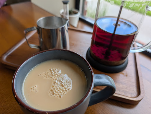 Stopped in this morning with a friend. I enjoyed a nice French Press pot of Earl Grey tea. We shared a cinnamon roll and she ordered a quad shot mocha. It was the first time I've heard her say the coffee was robust enough to give her a buzz. So, the coffee can be strong. She did enjoy the flavor. My Earl Grey was nice, but nothing super memorable about the flavor. The cinnamon roll was heavy on the glaze, but had good structure and was a nice offset to the beverages.